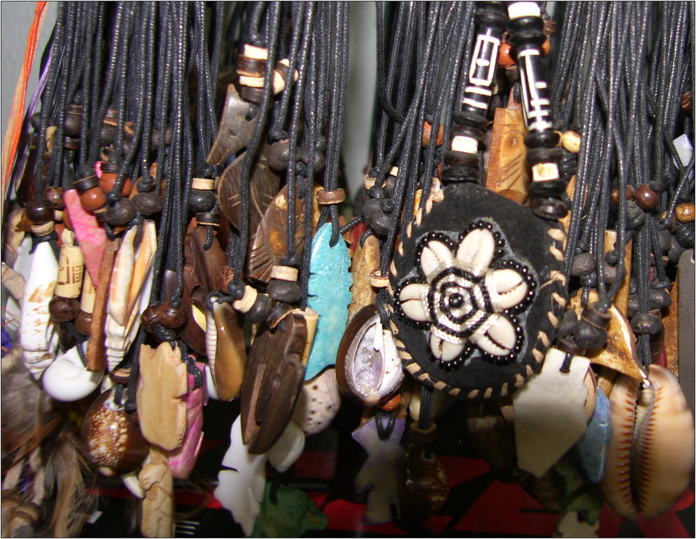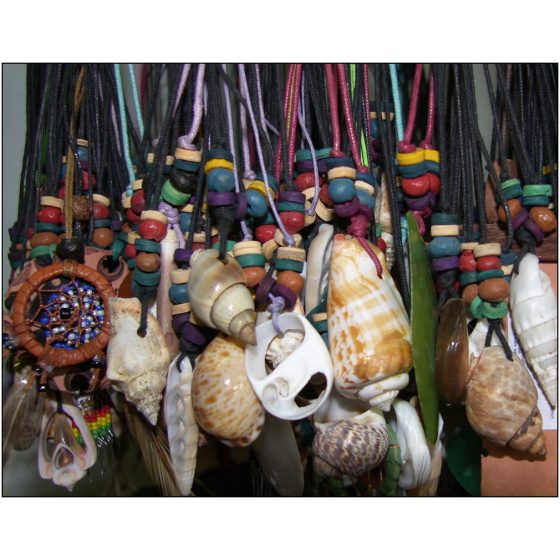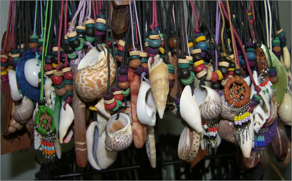 různé druhy mušlí na kožené šnůrce + korálky