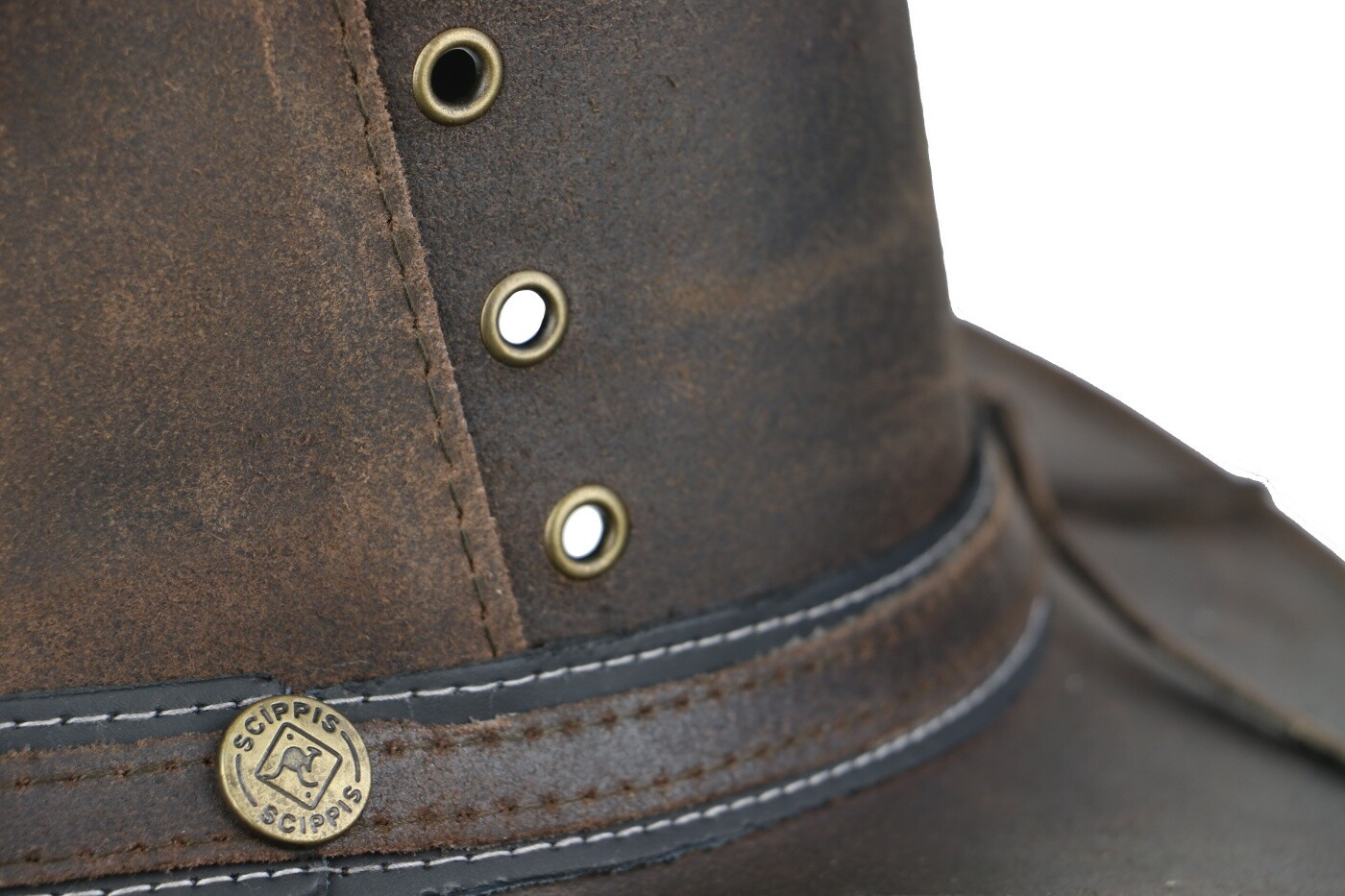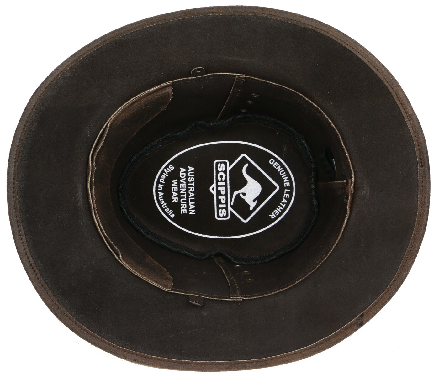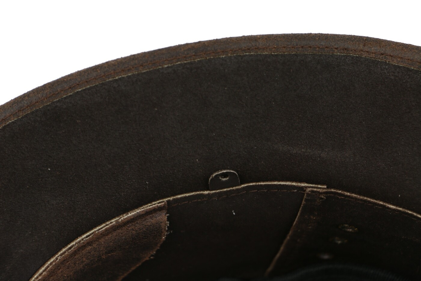 Longford od SCIPPIS vyroben z robustní a silné hovězí kůže má nový inovativní design. Koruna klobouku je rozdělena švem na dva díly a větrací otvory jsou umístěny svisle na švu. Ozdobný pásek je ze dvou na sebe navrstvených kožených pásků v černé a hnědé barvě. Uvnitř klobouku jsou malé otvory, které umožňují snadnou montáž řemínku pod bradu. Hovězí impregnovaná kůže je odolná vůči počasí.