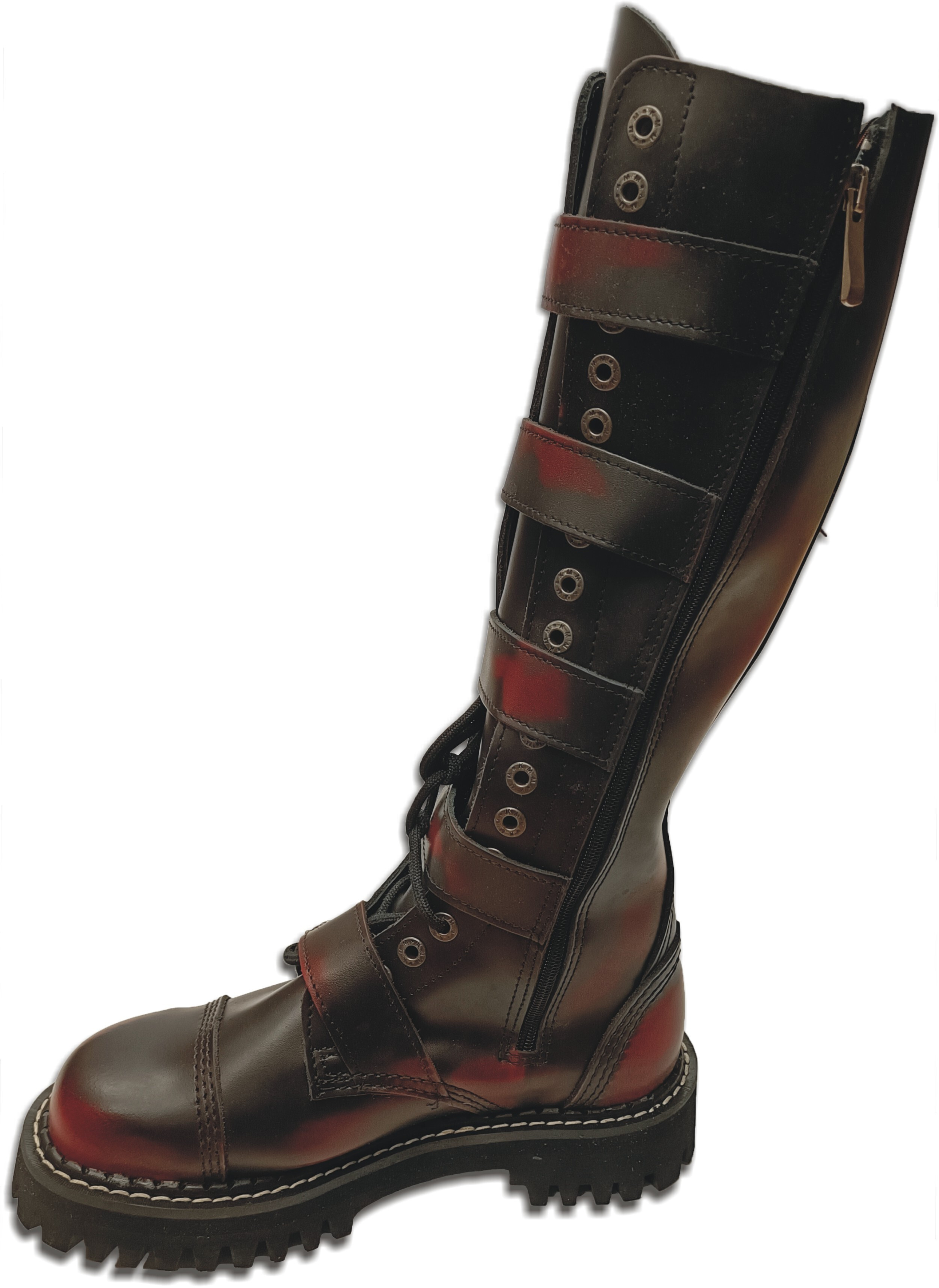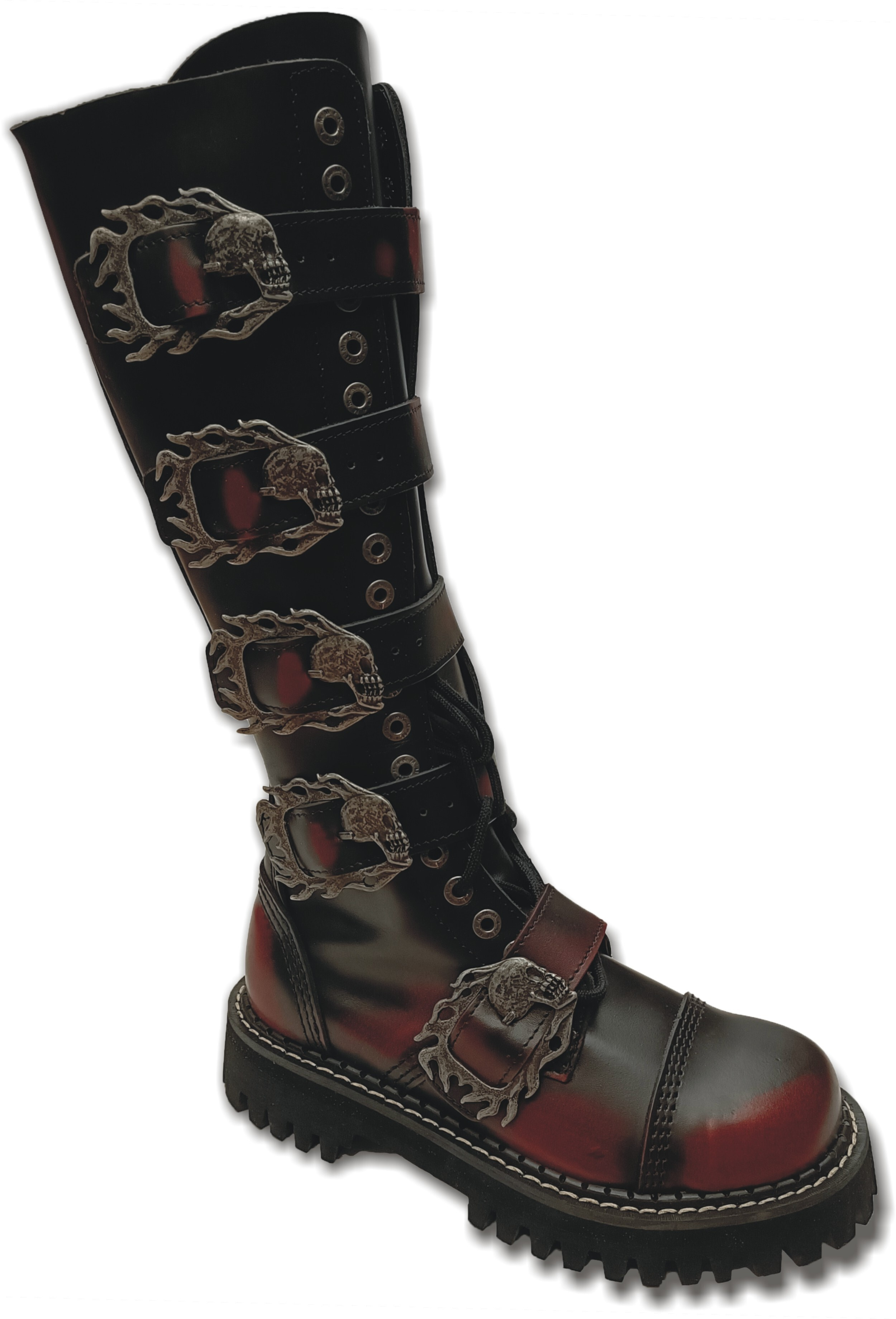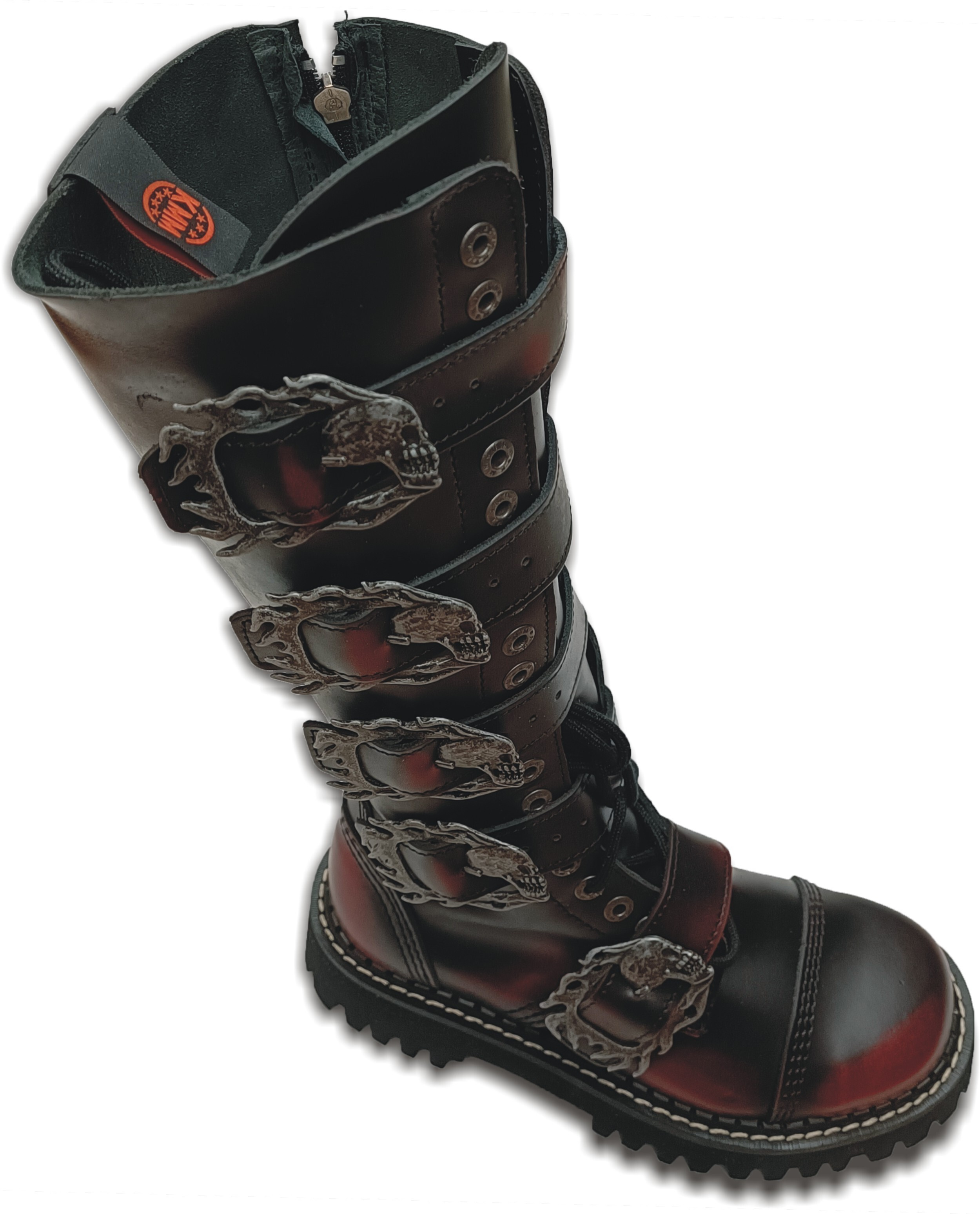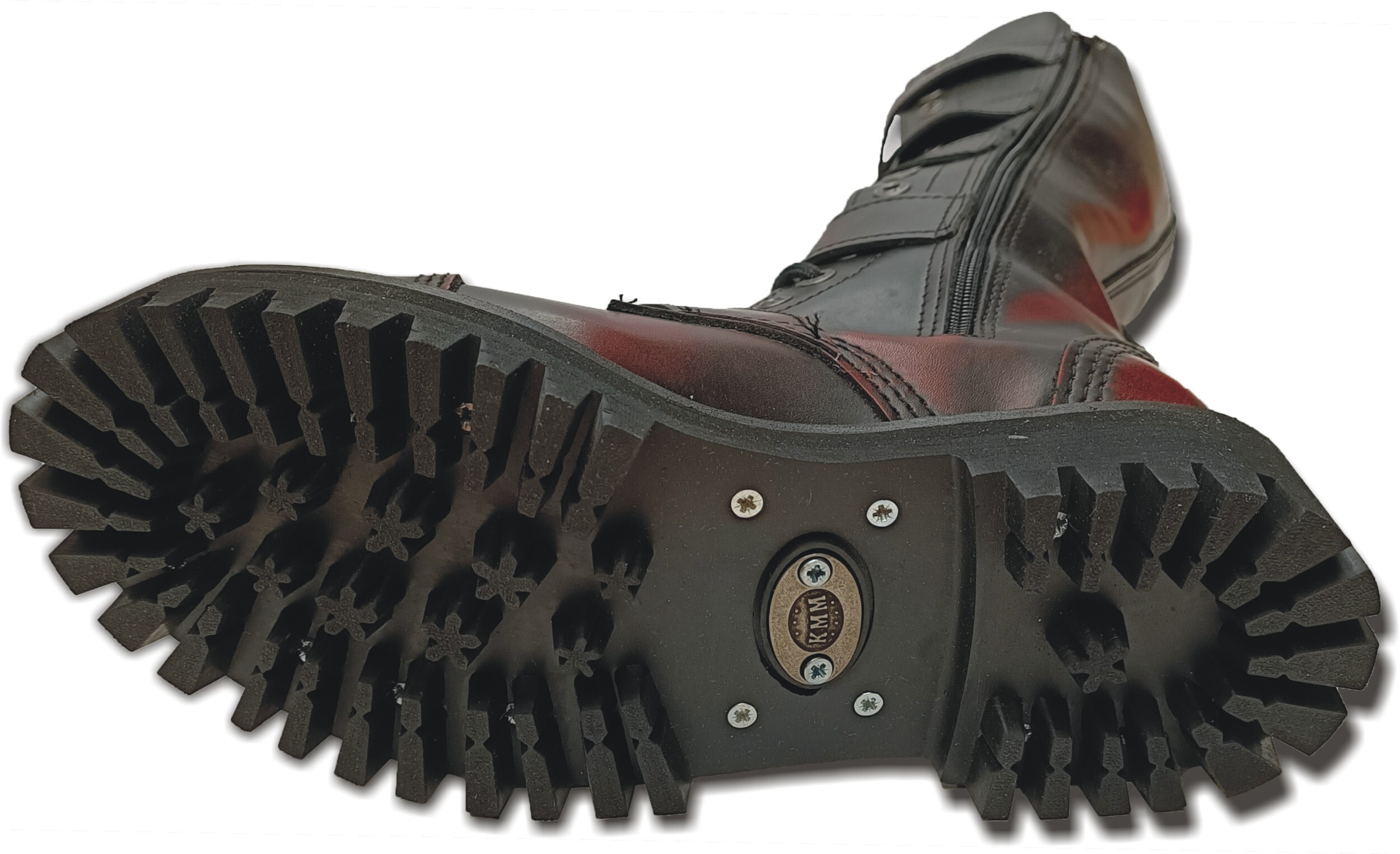 Zakázková výroba, pokud není požadovaná velikost skladem, bude dodací doba cca 1-3 měsíce. Svršek je ušit ze silné hovězí usně, ve špici je vložena ocelová kaple. Odolná originální polstrovaná podrážka KMM The original boots o výšce 3 cm, podpatek má výšku 4,5 cm, s výrazným vzorkem, nerezovými šrouby a logem výrobce. Trojité švy zaručují dlouhodobou odolnost. Oproti vzhledově podobným botám jiných výrobců se obuv KMM vyznačuje vysokou jakostí použitých materiálů, precizním zpracováním a opravdu dlouhou životností. V každém balení najdete i jedny náhradní šňůrky.