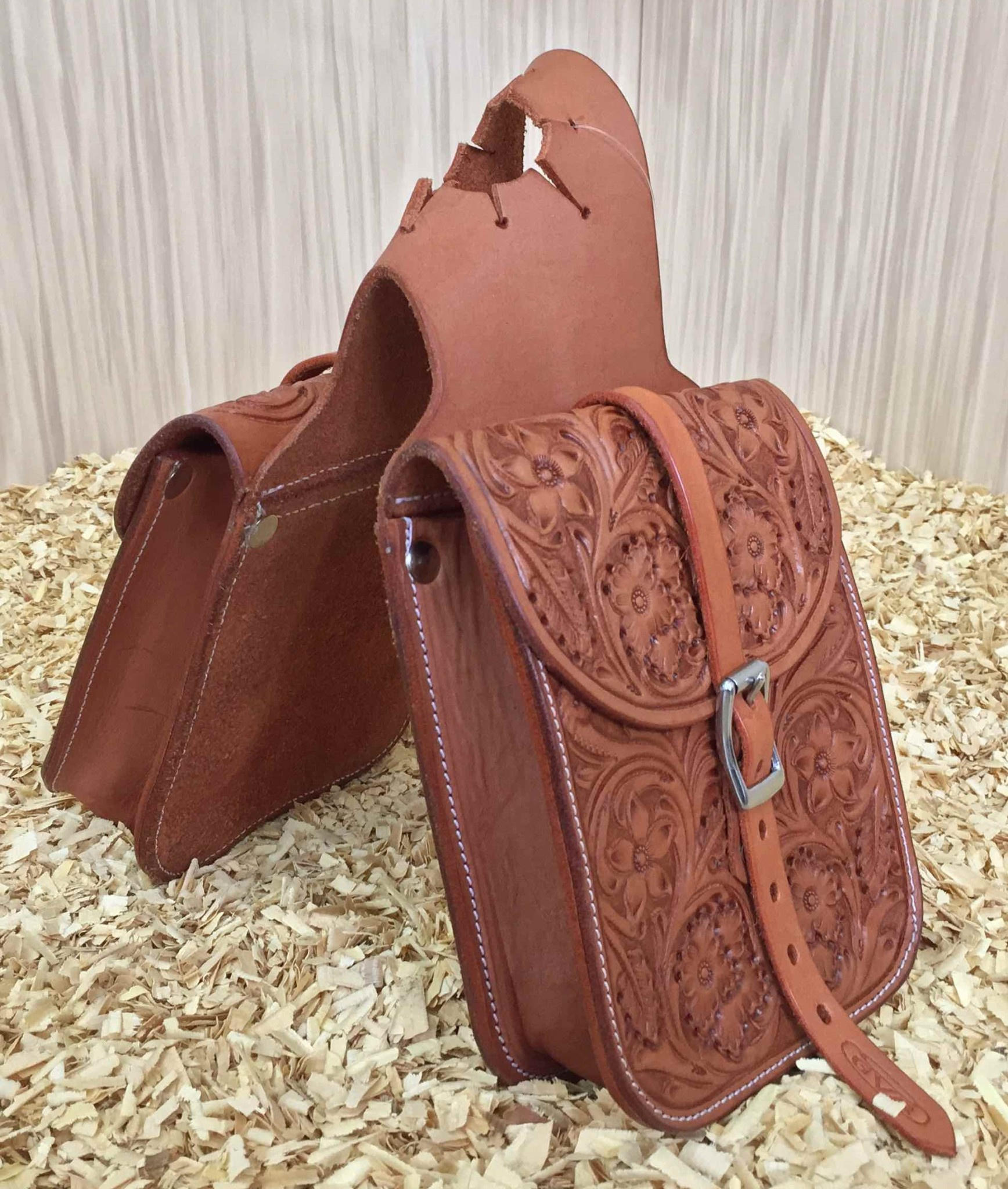 Brašny na hrušku westernového sedla vyrobeny z prvotřídní kůže Sadesa zdobené květinovým vzorem. Kování je z nerezové oceli, místo šroubů lze osadit ozdobnými končaky.