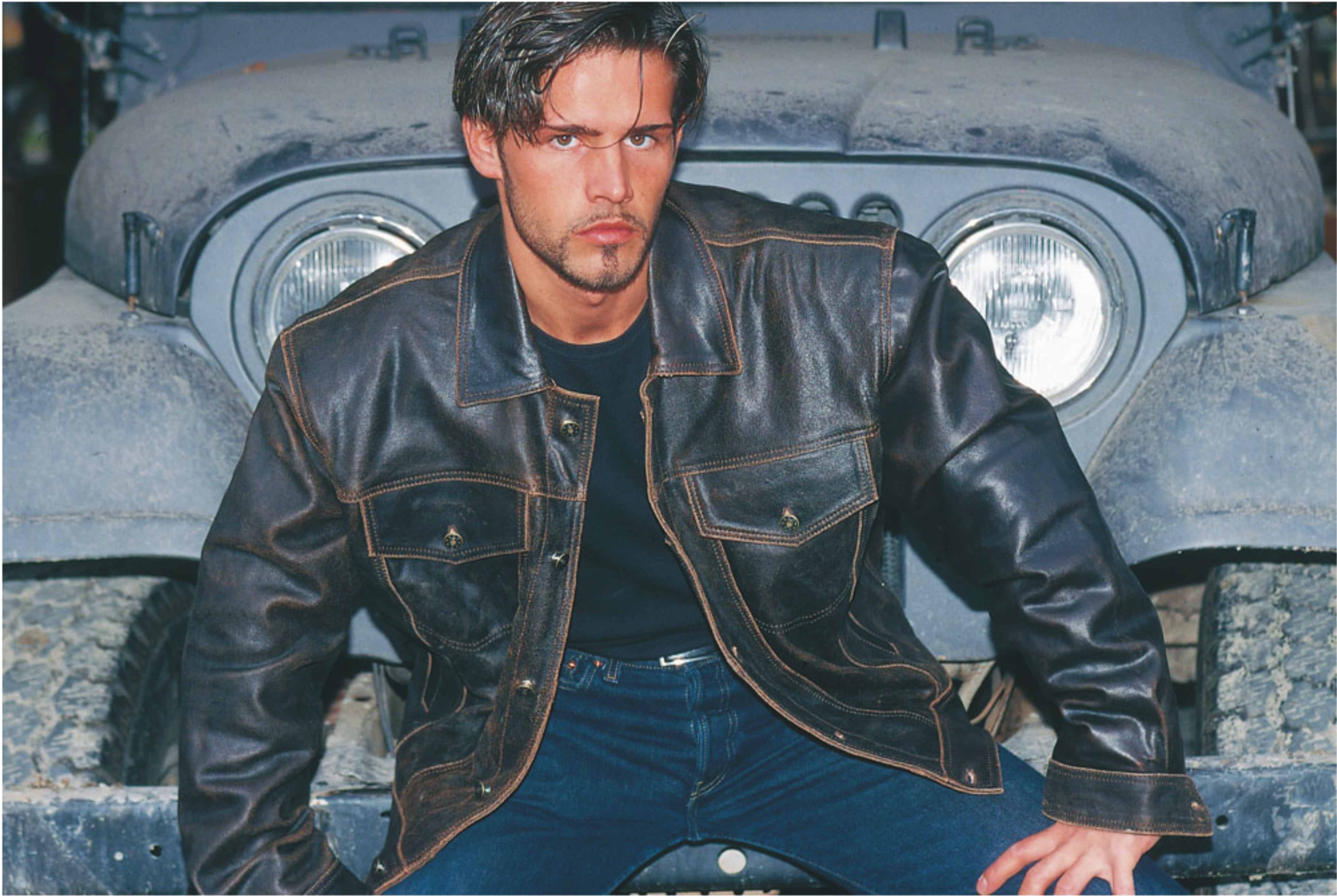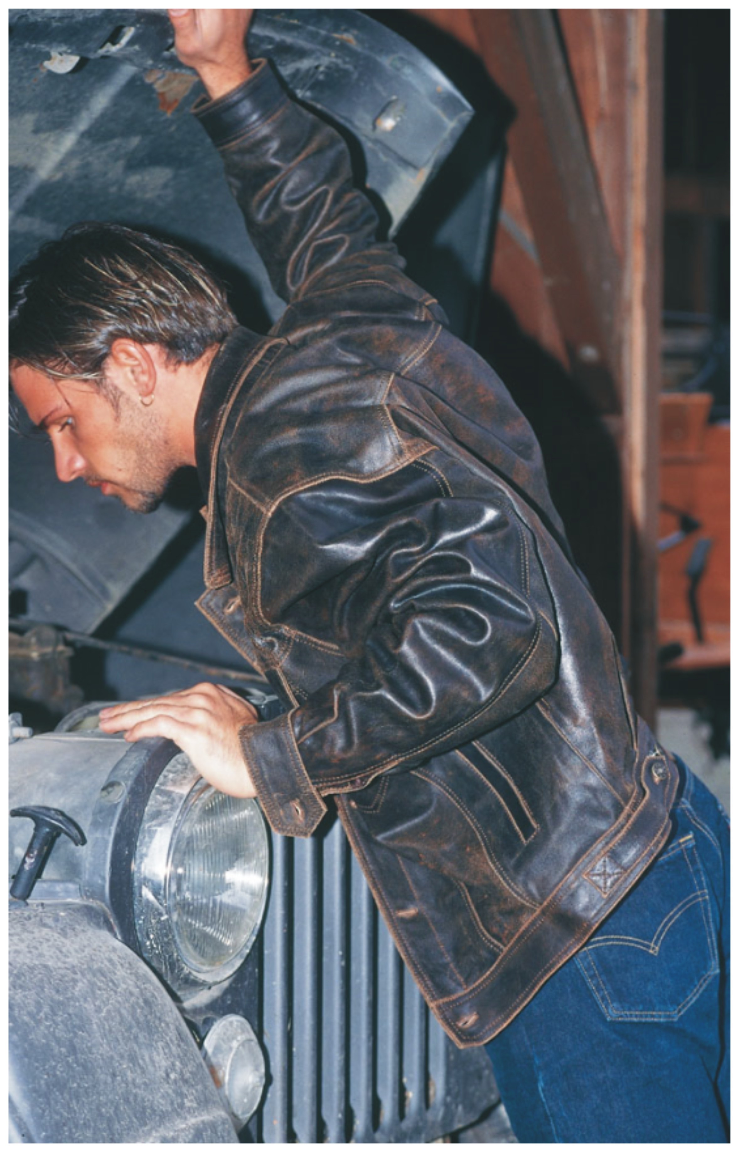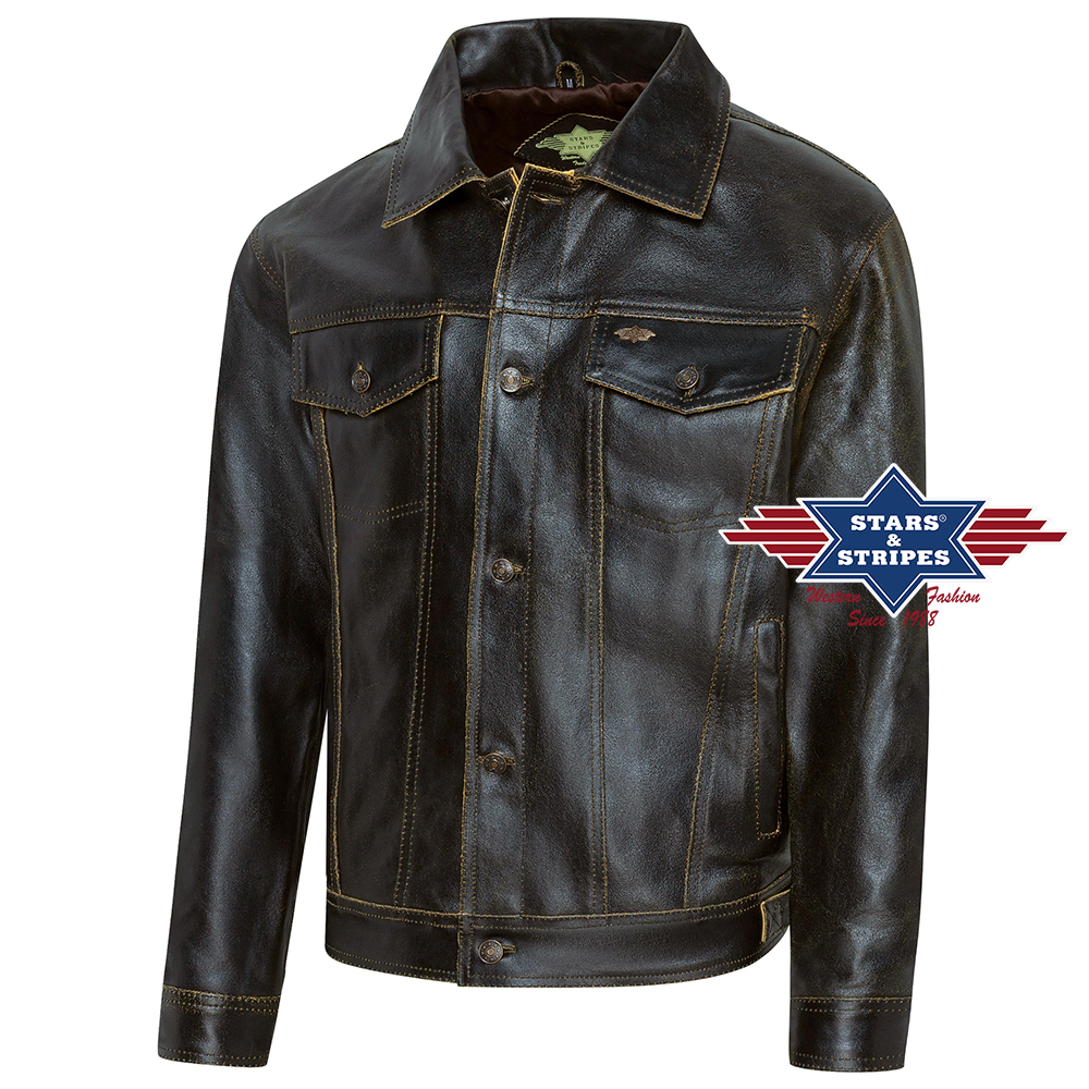 Robusní kožená bunda obnošeného vzhledu s patinou. Dvě boční kapsy, dvě náprsní kapsy s uzavíráním na knoflíky a dvě vnitřní kapsy. Klasický jeansový střih vás udělá neodolatelným.