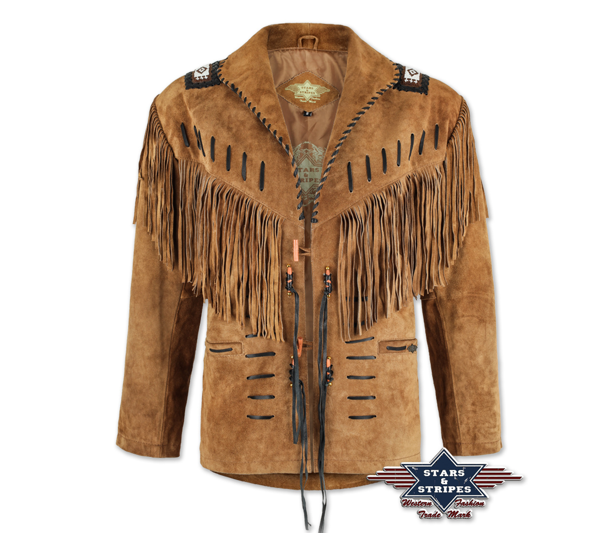 Stylová westernová bunda z drásané kůže s ozdobnou nášivkou na ramenou a jednou vnitřní kapsou. Třásně vepředu, vzadu i na rukávech.