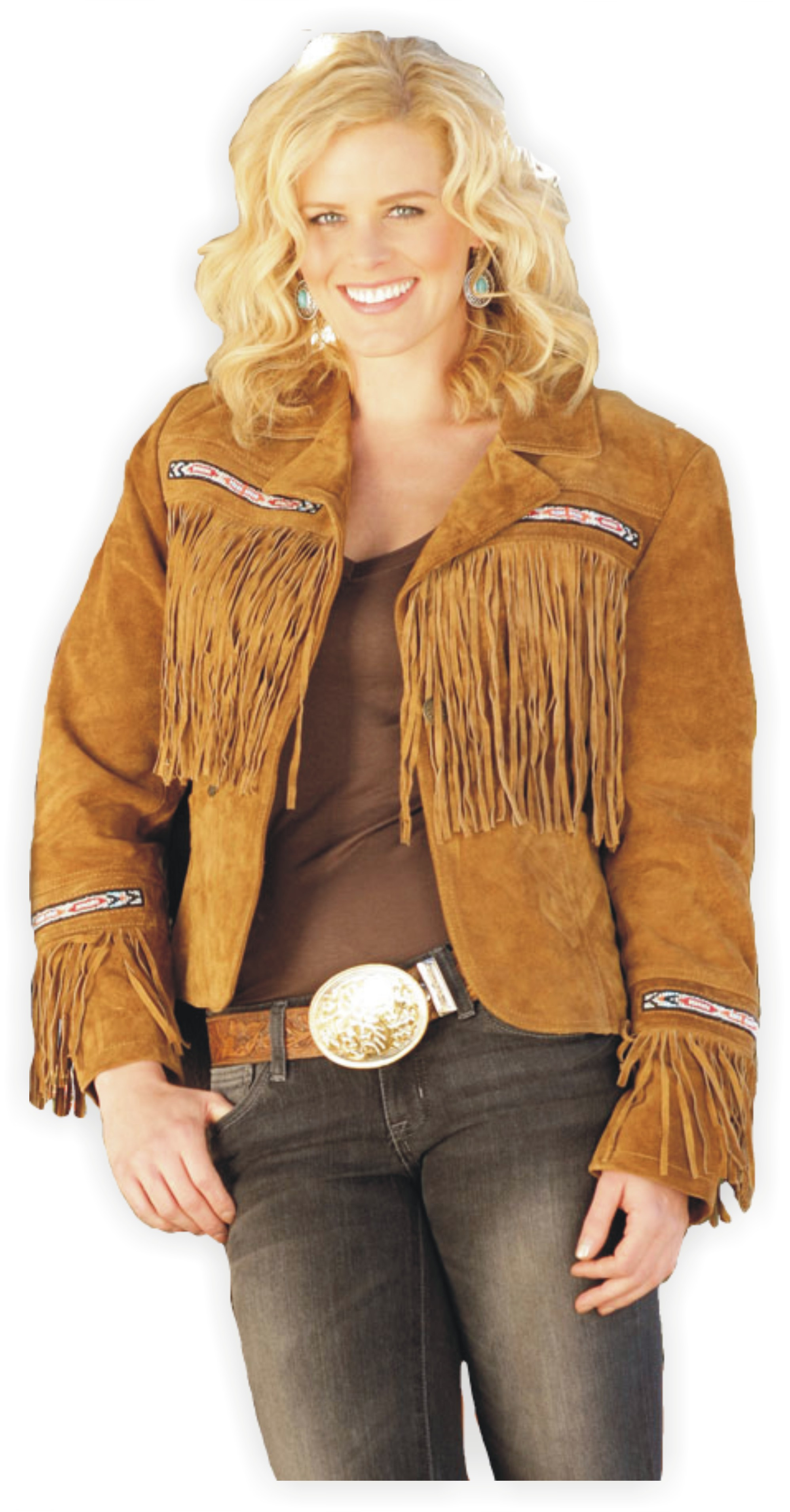 Dámská bunda z nejkvalitnější broušené kůže s třásněmi a zdobením.