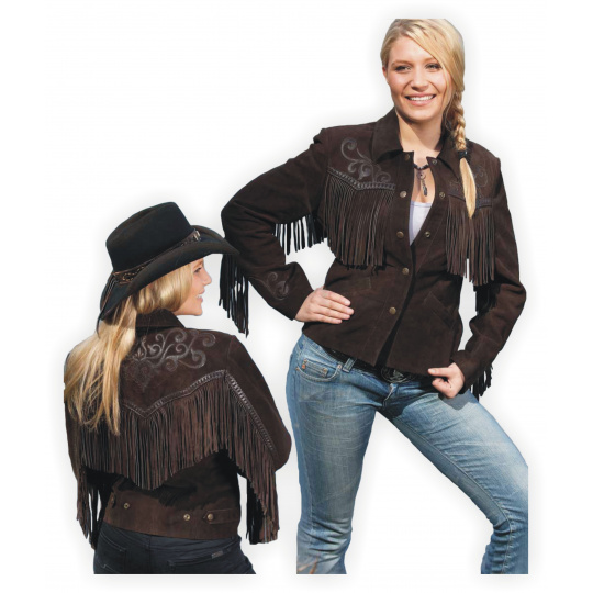Elegantní dámská westernová bunda z hovězí kůže zdobená třásněmi, našitými vzory na zádech, ramenou a rukávech a kovovými druky.