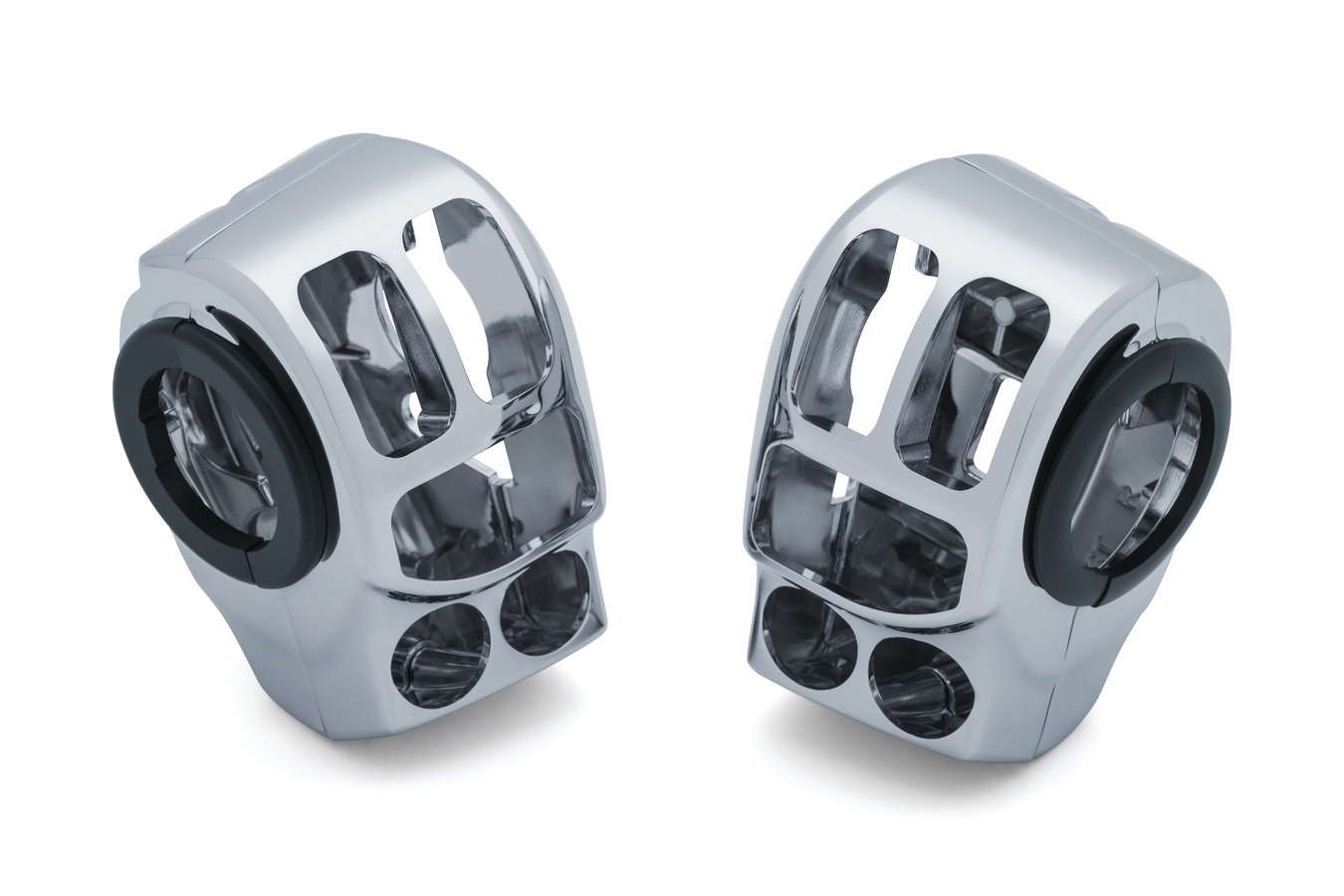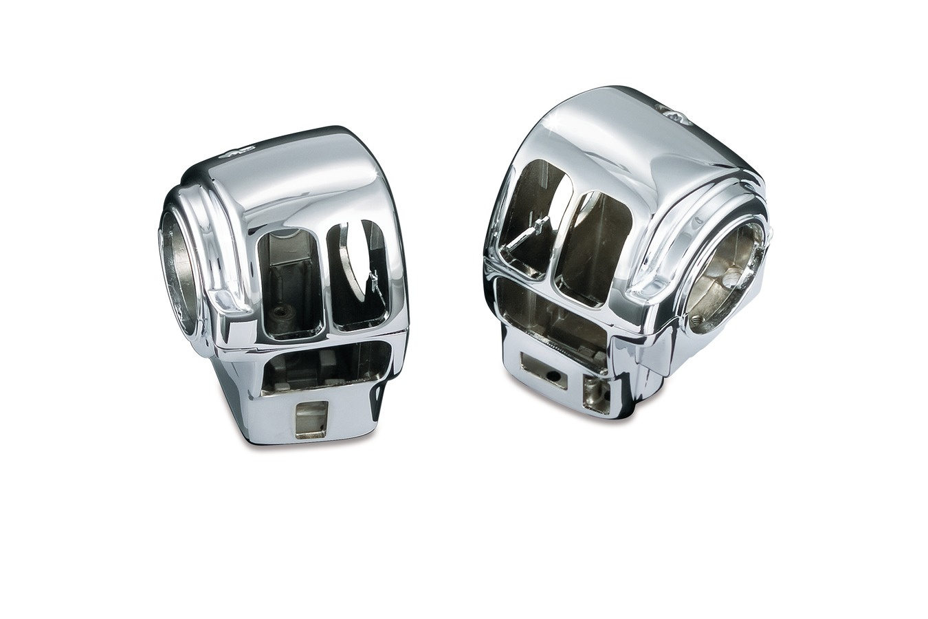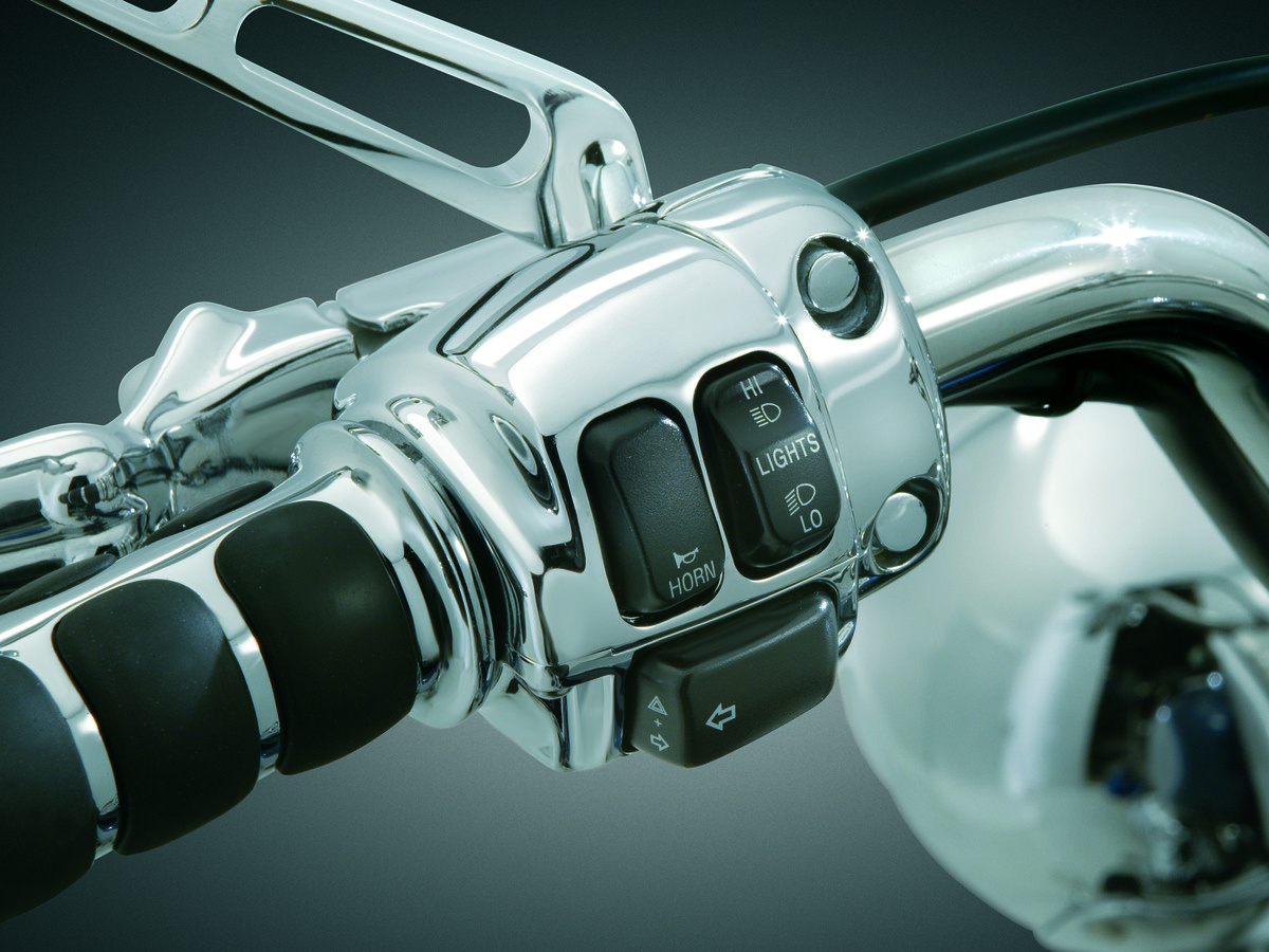 Chromovaný kryt domečků/přepínačů Kuryakyn doladí řídítka do celkového dojmu - chromu není nikdy dost.