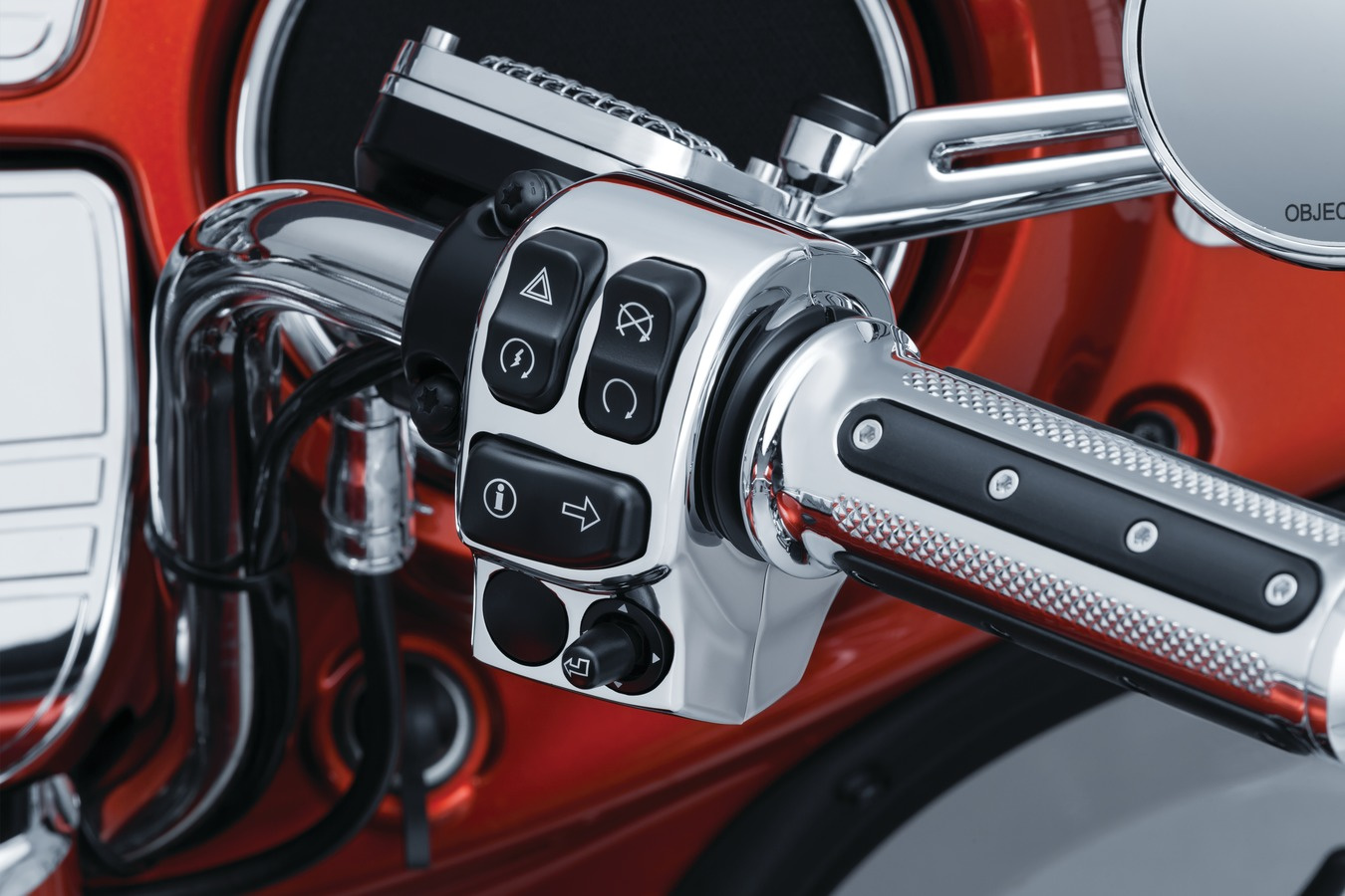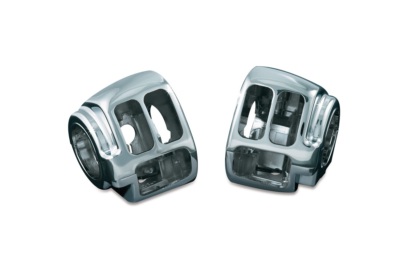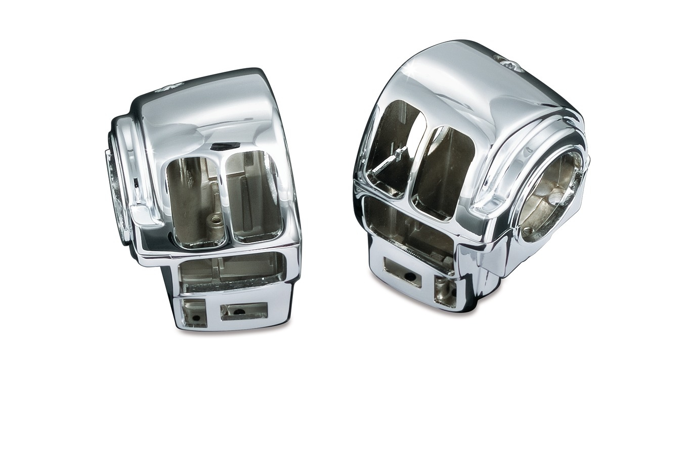 Chromovaný kryt domečků/přepínačů Kuryakyn doladí řídítka do celkového dojmu - chromu není nikdy dost.
