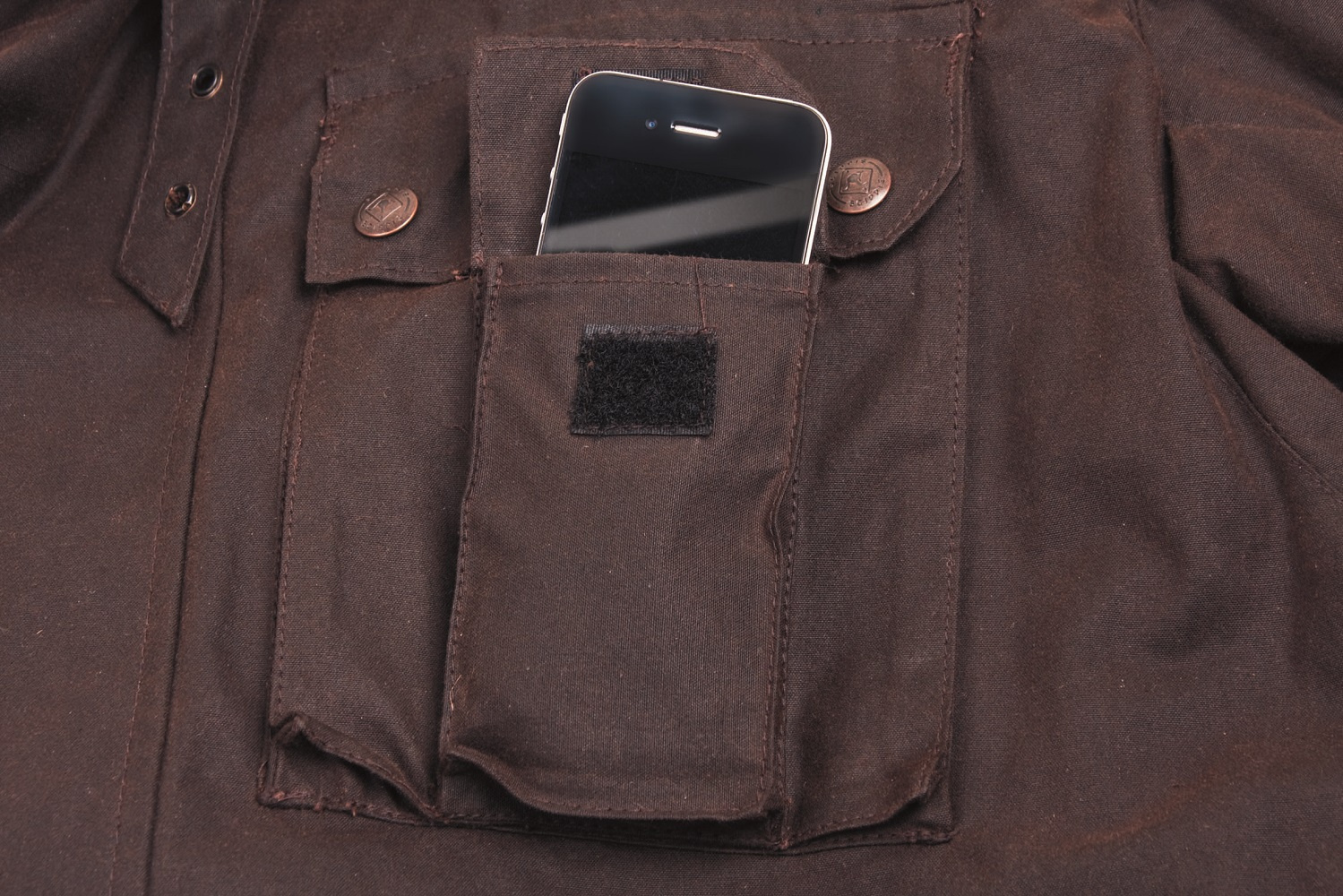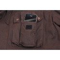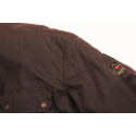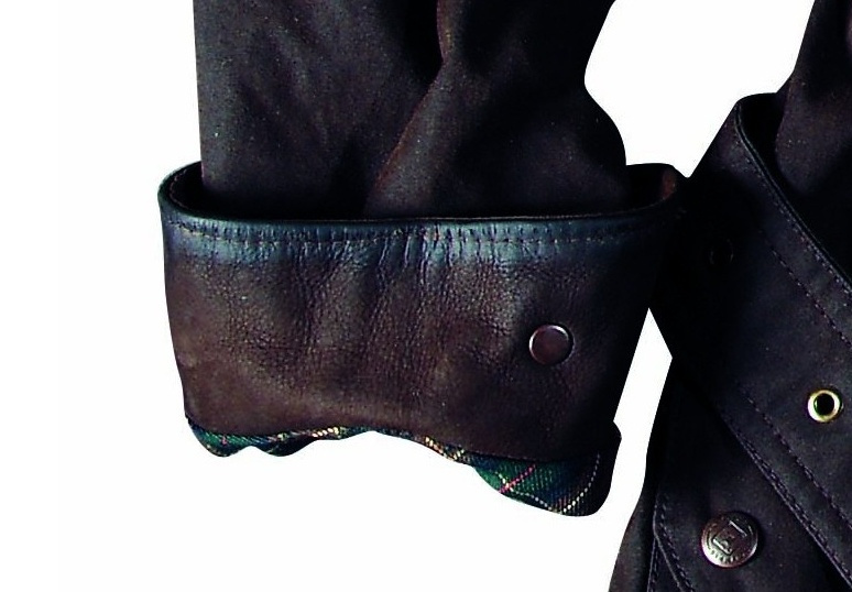 Bunda má krátký stojatý límec a vnitřní manžety z impregnované kůže, která nebarví. Manžety lze regulovat za pomocí druků. Bunda je vybavena spoustou praktických kapes s uzavřením na druky. Dolní kapsy jsou multifunkční, ruce si do nich můžete zasunout z vrchu i z boku.