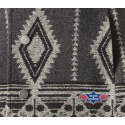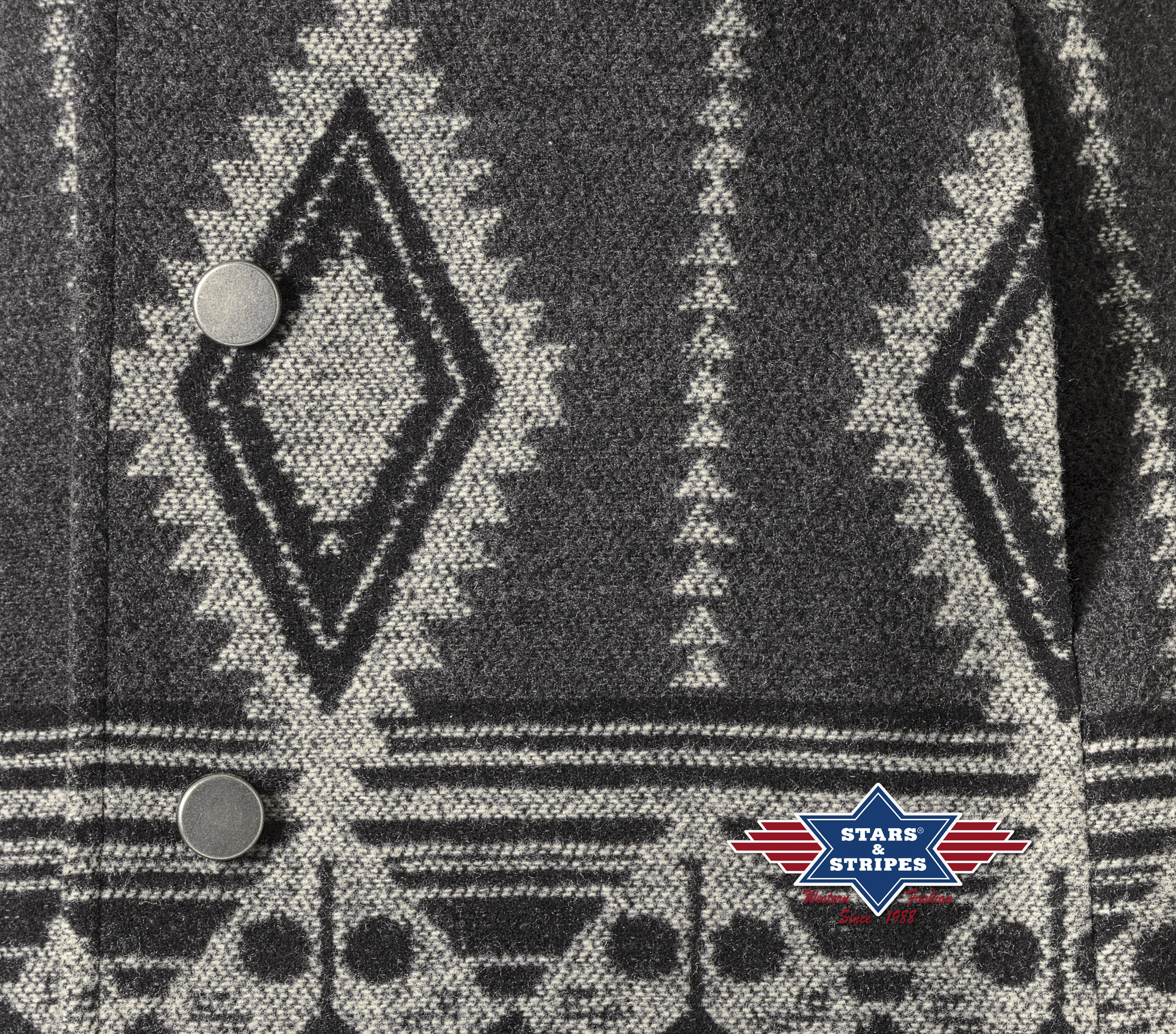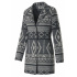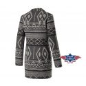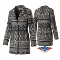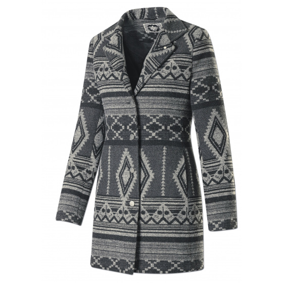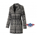 Stylový dámský kabát s prošívanou podšívkou, vnější vzhled s aztéckými motivy. Vnější skryté kapsy a jedna vnitřní kapsa.