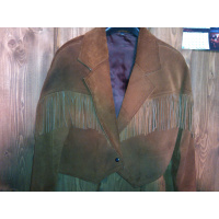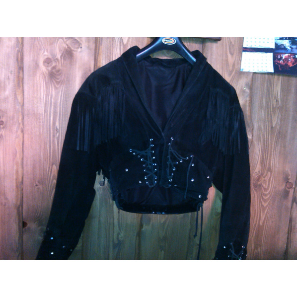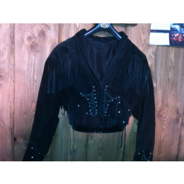Popis produktu dámská kožená bundička s třásněmiKvalitní dámská kožená kratší bunda z broušené kůže s třásněmi. Barva: černá Velikost: S,M? nošená - bazar, zachovalá