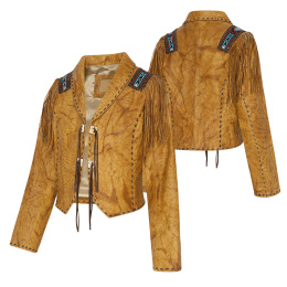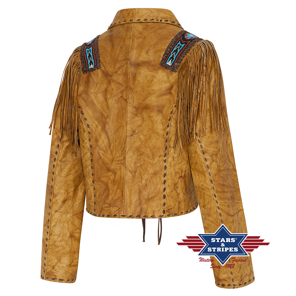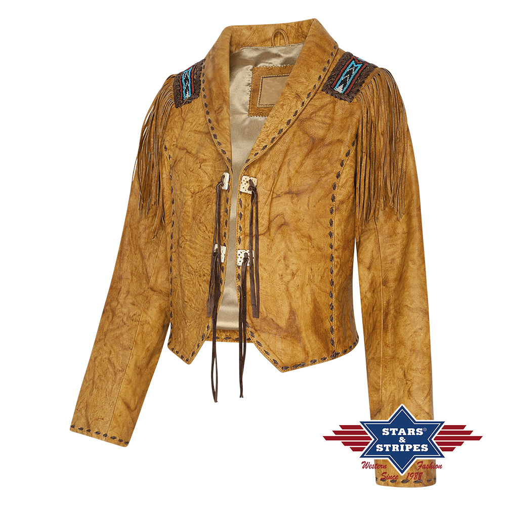 Stylová, velmi kvalitní, westernová/indiánská dámská bunda. Vyrobená z měkké hověziny velmi pohodlná a prodyšná. Zdobená třásněmi, indiánskými korálky, stylovým šněrováním a patinou.