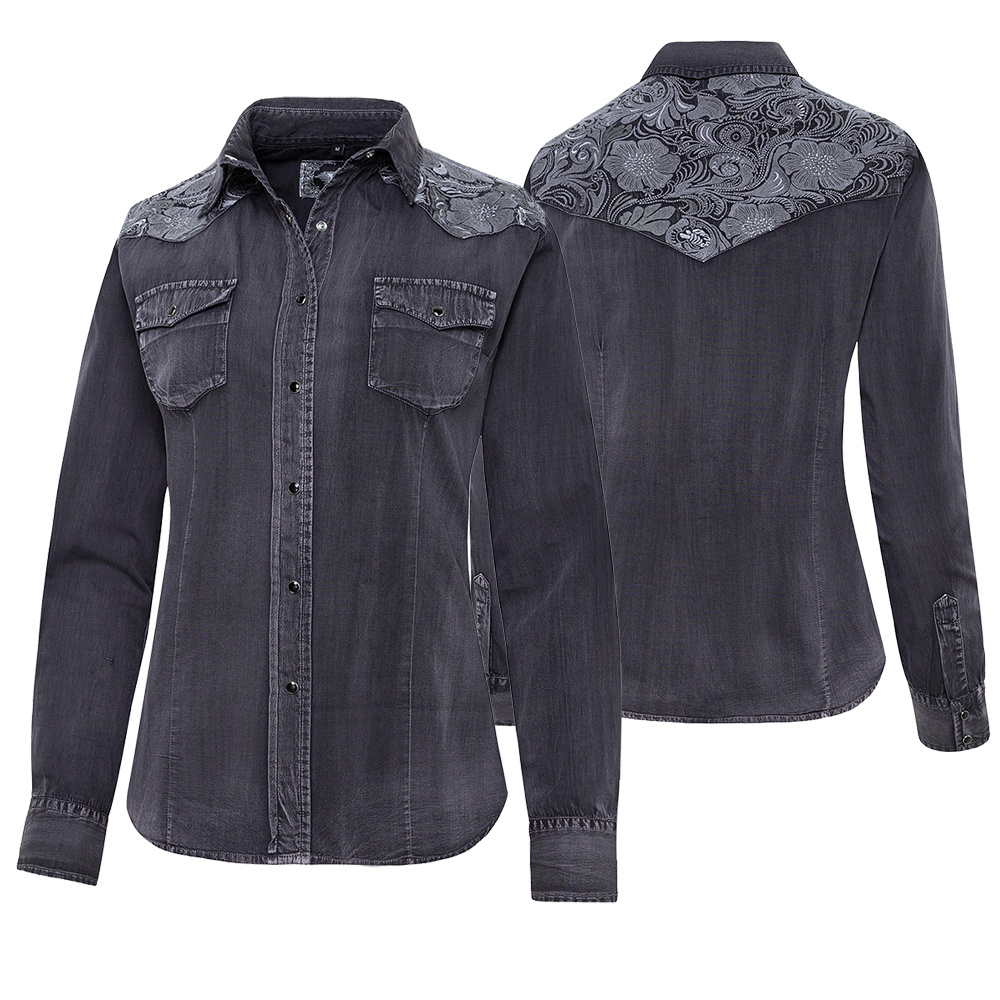 Stylová dámská košile s patinou a s vyšívaným westernovým sedlem květinového vzoru. Košili dotváří náprsní kapsy, světlé švy a černé druky. Do páru s pánskou košilí Fred.