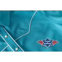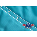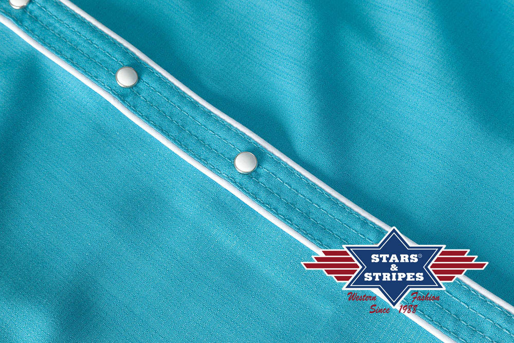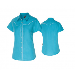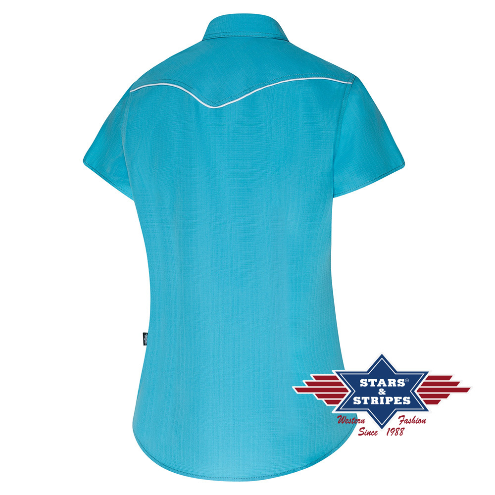 Jemná stylová dámská košile/halenka zdobená westernovým sedlem s bílým lemováním a třpytivými knoflíčky/cvočky. Svěží azurová barva v kombinaci s bílým lemováním dodávají halence velmi zvláštní nádech. Halenka je příjemná na nošení a její lehké linie krásně zvýrazňují ženskou postavu.