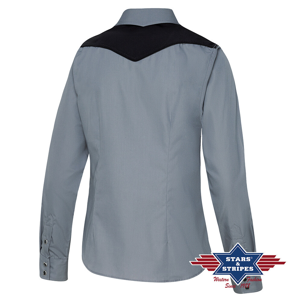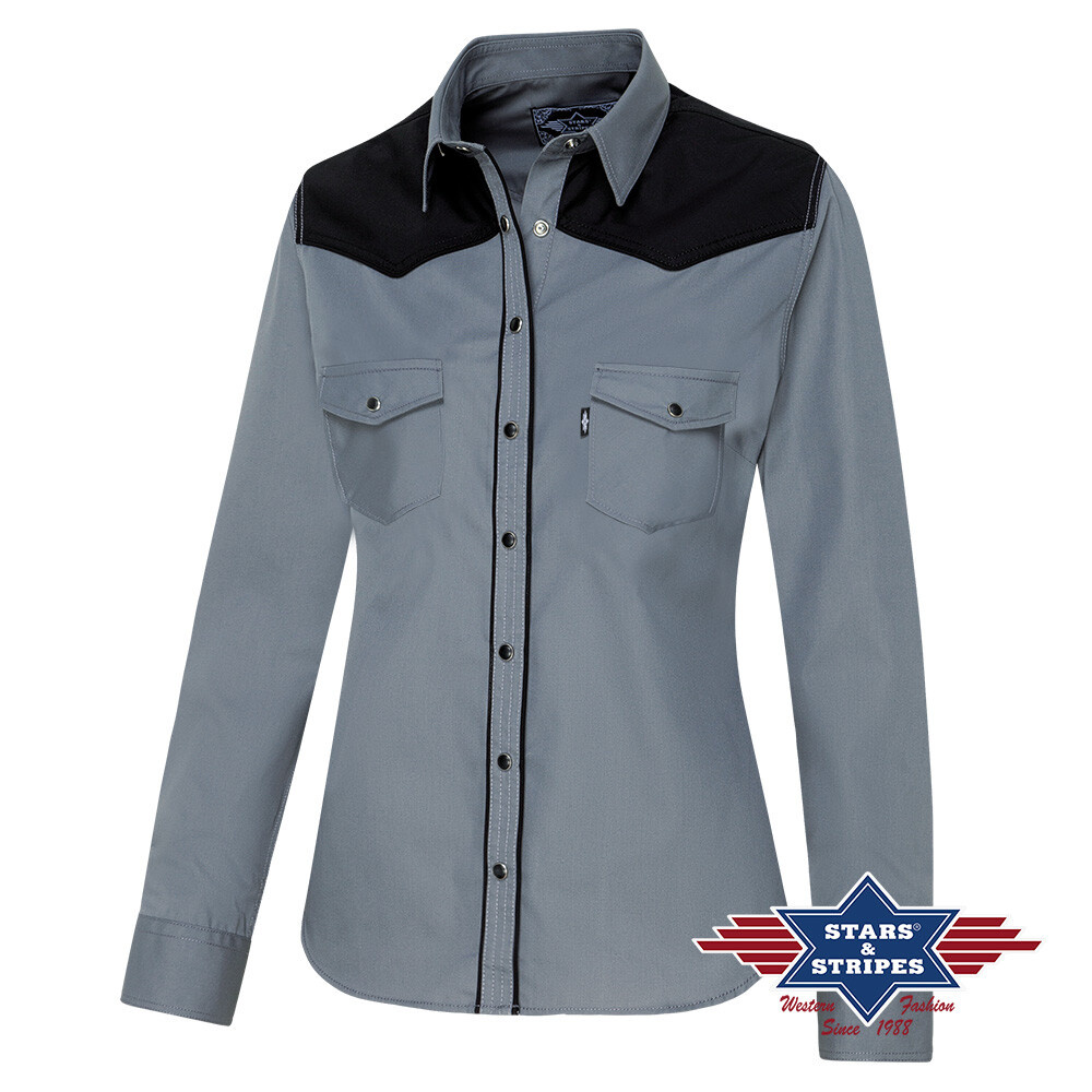 Stylová dámská westernová košile/halenka zdobená kontrastním westernovým sedlem, stylovými knoflíčky a náprsními kapsami. Halenka je příjemná na nošení a její lehké linie krásně zvýrazňují ženskou postavu. Do páru s pánskou košilí A-19.
