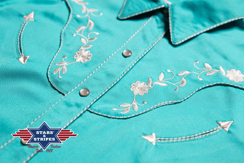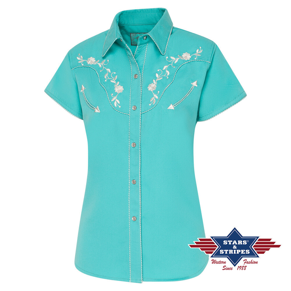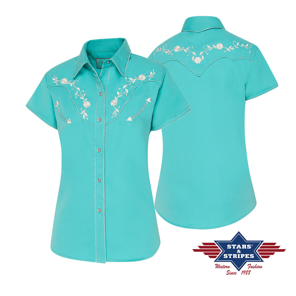 Stylová, detailně vyšívaná dámská westernová halenka s krátkým rukávem, westernovým sedlem a falešnými náprsními kapsami. Design doplňuje lemování sedla, knoflíkové léze a límce. Promyšlený střih perfektně zvýrazní ženskou postavu.