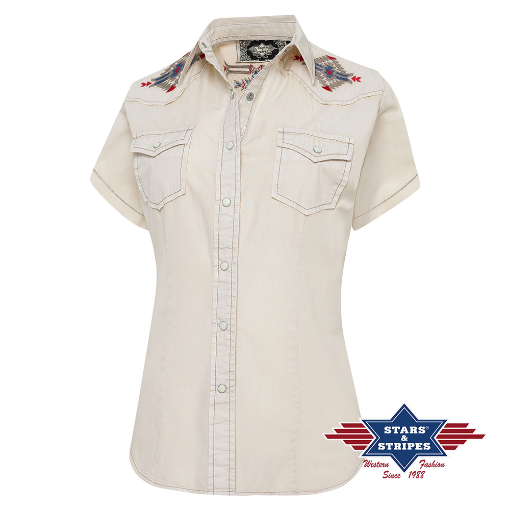 Nevšední dámská westernová halenka v béžové barvě s lehkou patinou a stylovou výšivkou v aztéckém stylu. Náprsní kapsy, decentní westernové sedlo a tmavé ozdobné švy uhranou každého milovníka westernové módy. Do páru lze sladit s dámskou halenkou Barney.