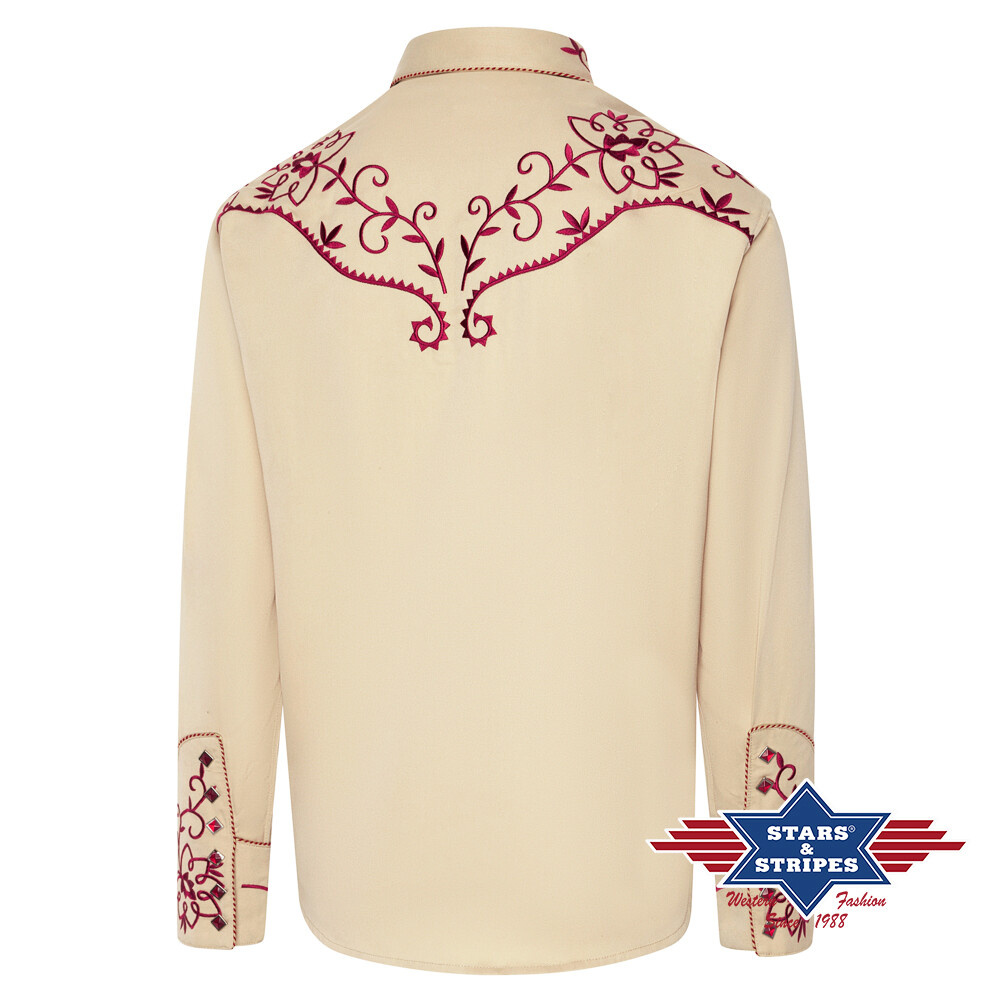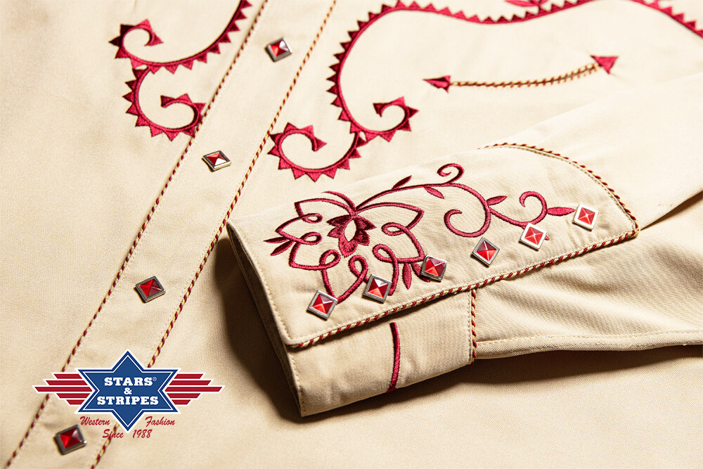 Nádherná stylová westernová košile s exkluzívní výšivkou na hrudi, zádech, manžetách a límci. Westernové sedlo, manžety, knoflíková léga a límec jsou zvýrazněny lemováním. Funkční náprsní kapsy a manžety se šesti knoflíčky umocňují styl klasické westernové módy. Košile kombinuje snadno udržitelnou texturu s velmi pohodlným střihem.