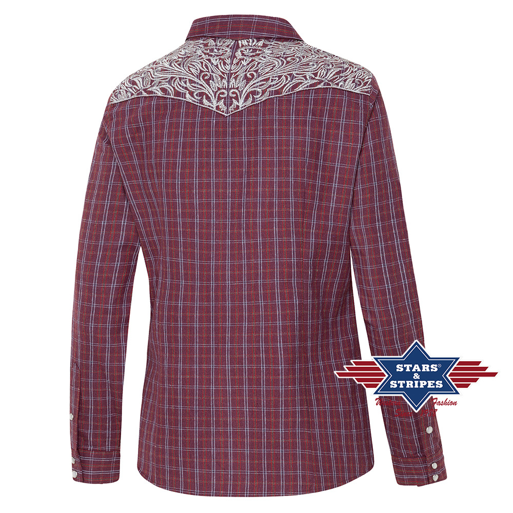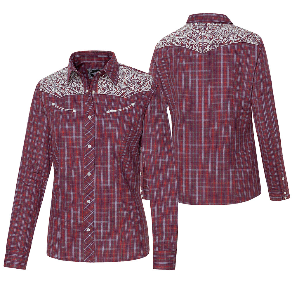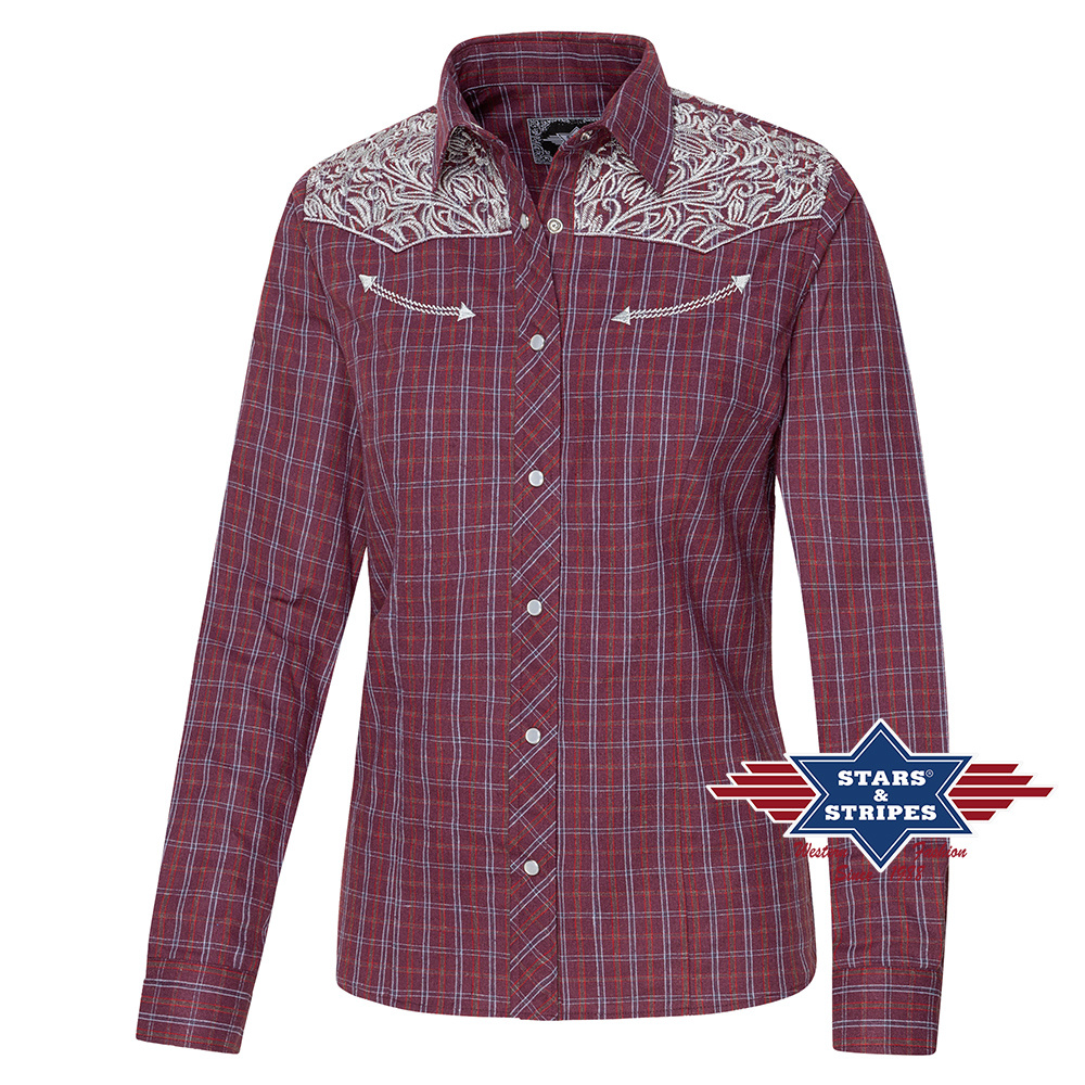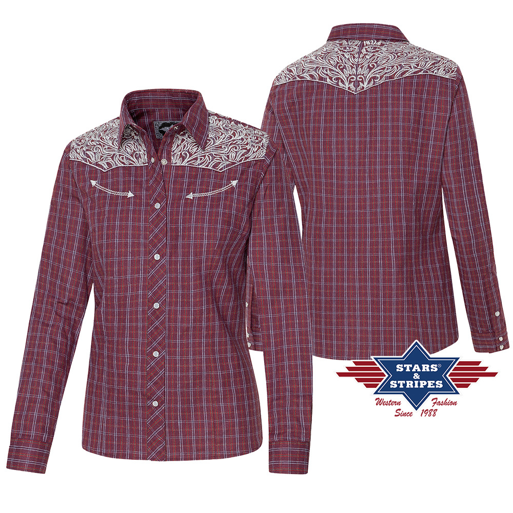 Stylová kostkovaná dámská košile s vyšívaným westernovým sedlem květinového vzoru. Košili dotváří falešné náprsní kapsy, lem v límci a slušivé patentky. Do páru s pánskou košilí Carlos.