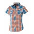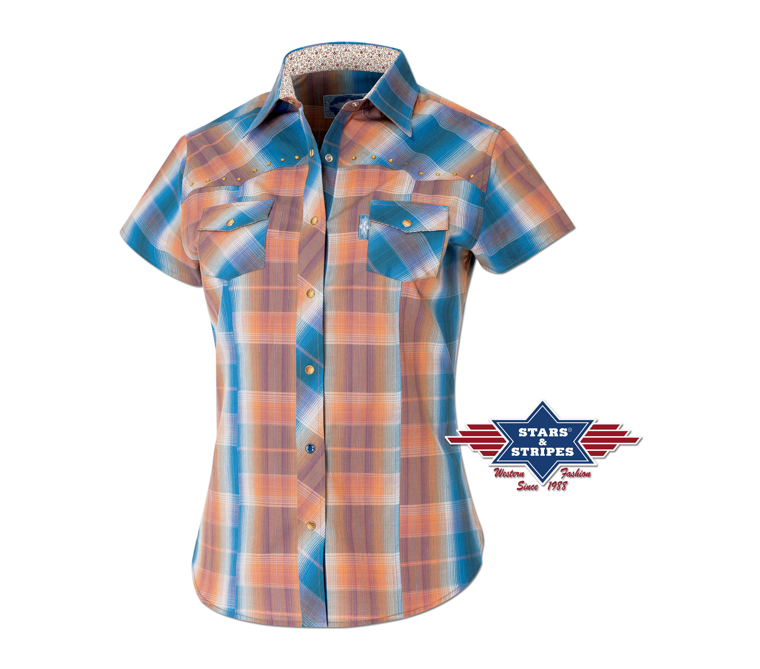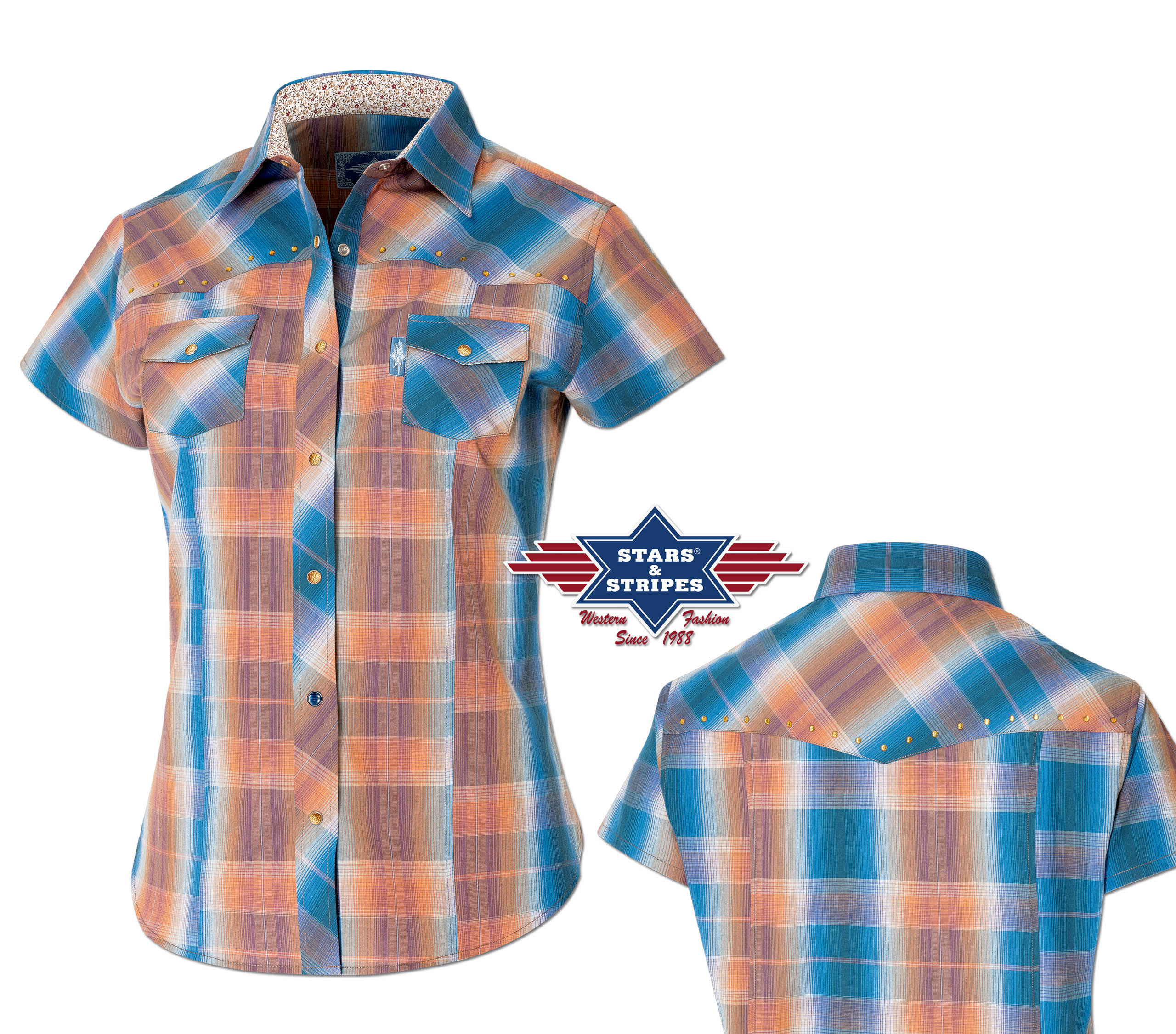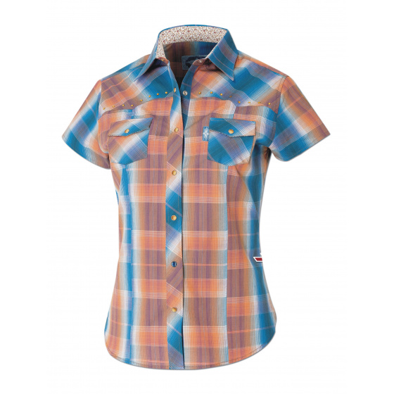 Stylová karovaná dámská halenka s krátkým rukávem, zdobená kamínky, s náprsními kapsami, zapínání na druky.