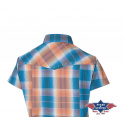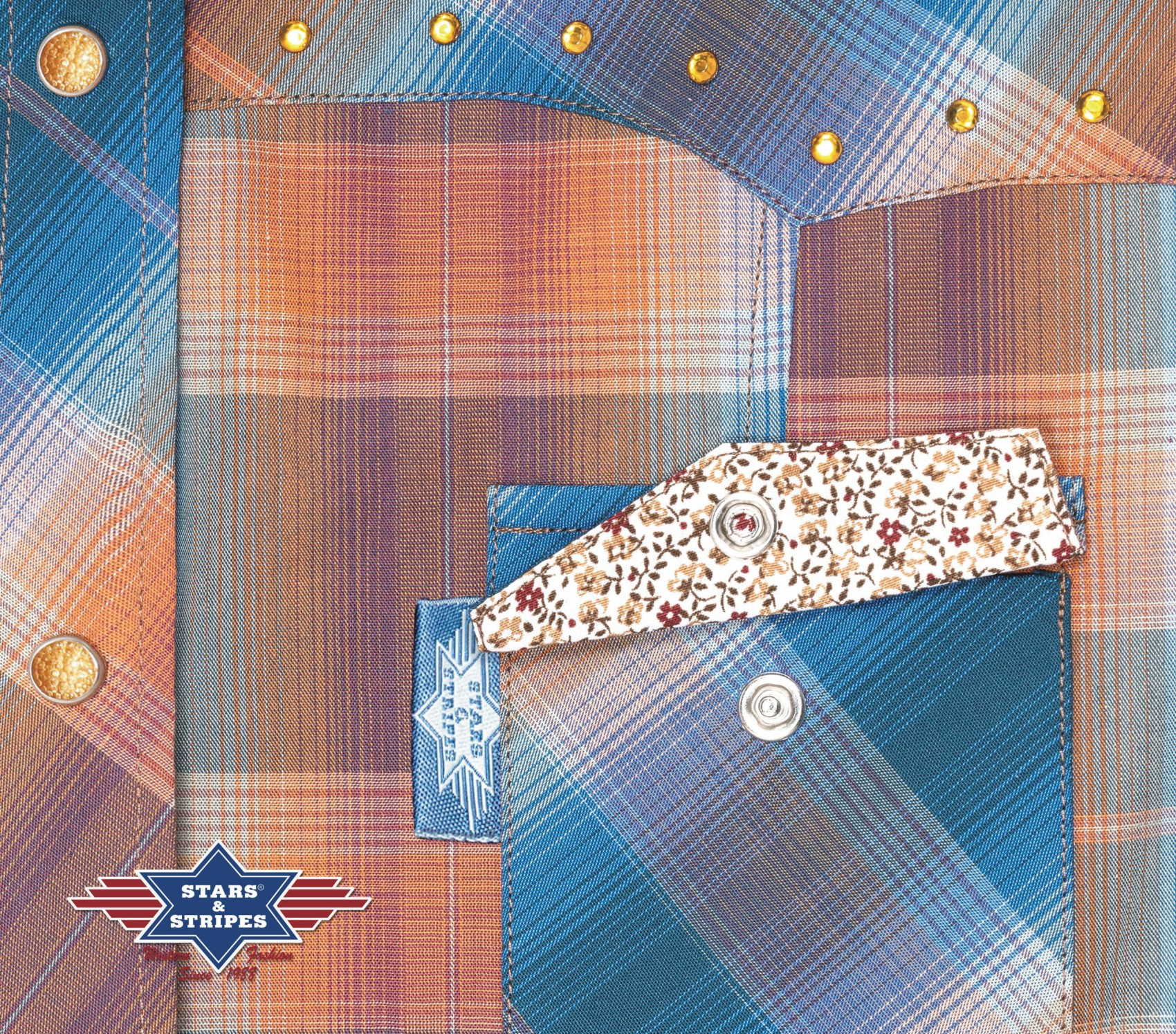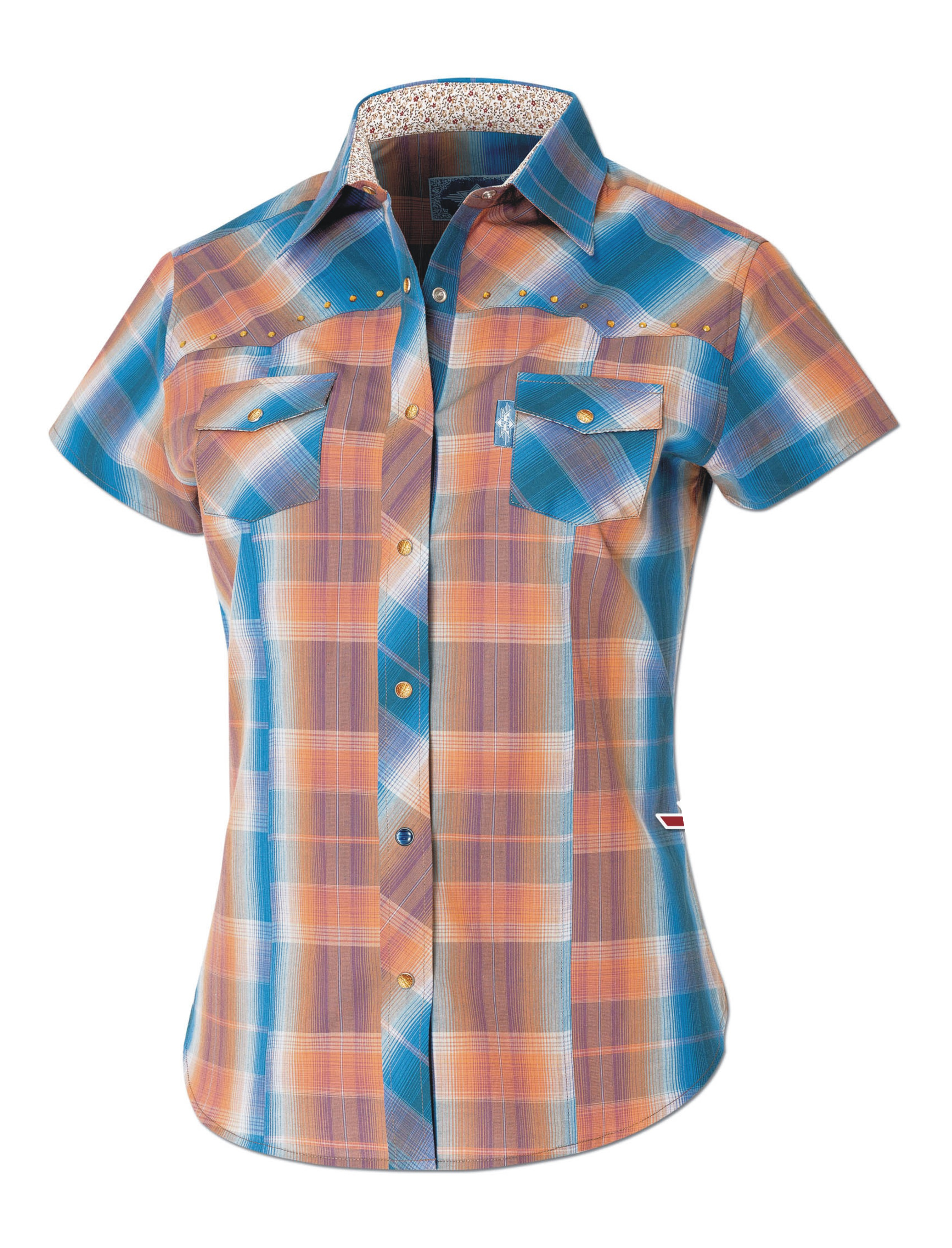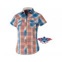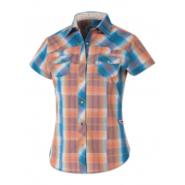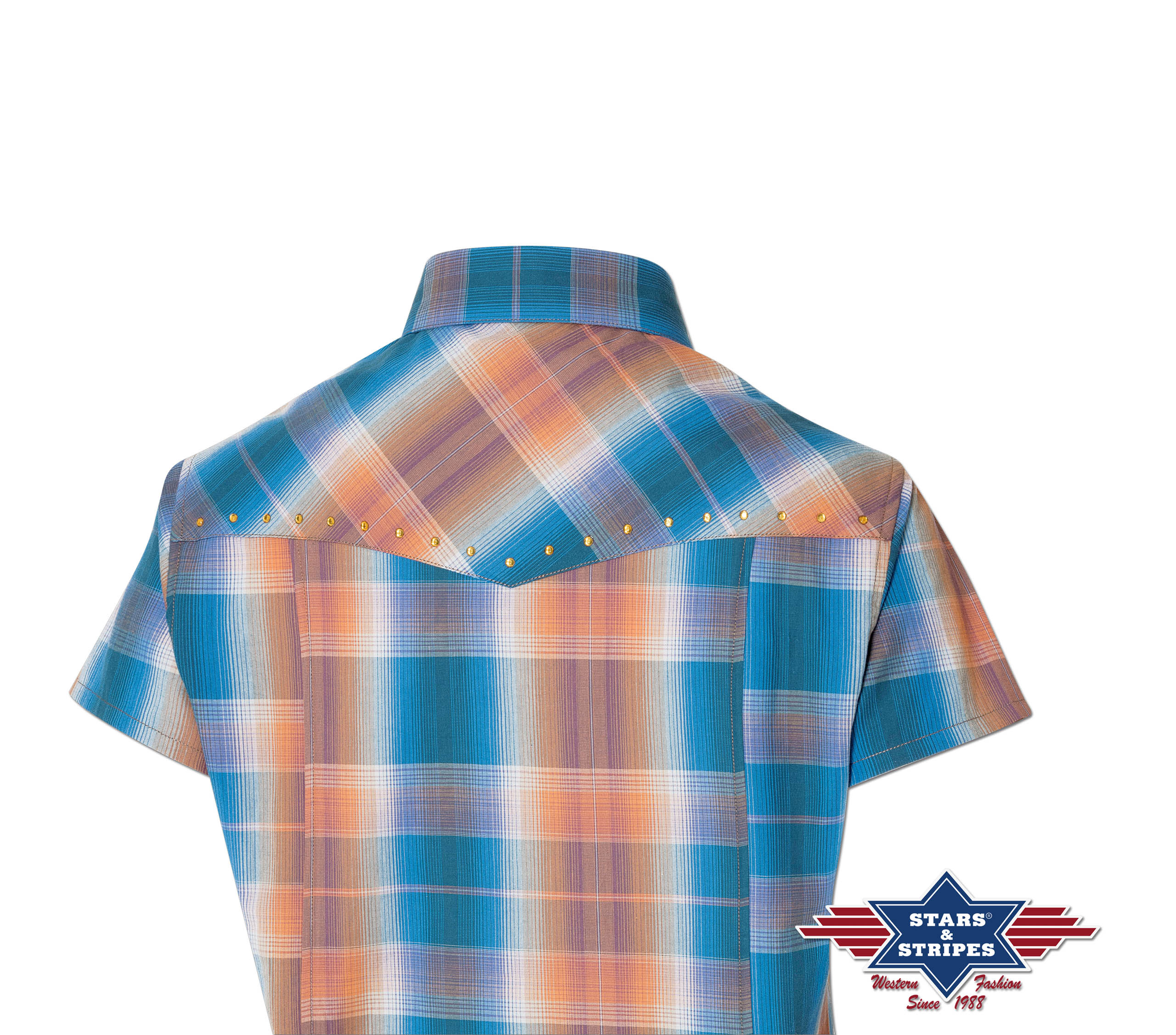 Stylová karovaná dámská halenka s krátkým rukávem, zdobená kamínky, s náprsními kapsami, zapínání na druky.