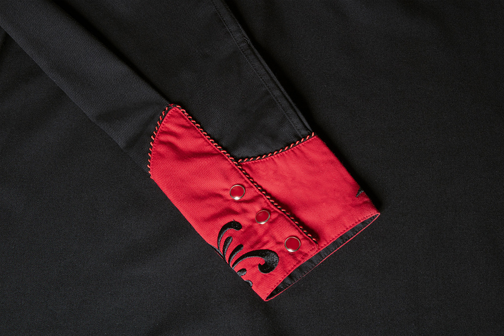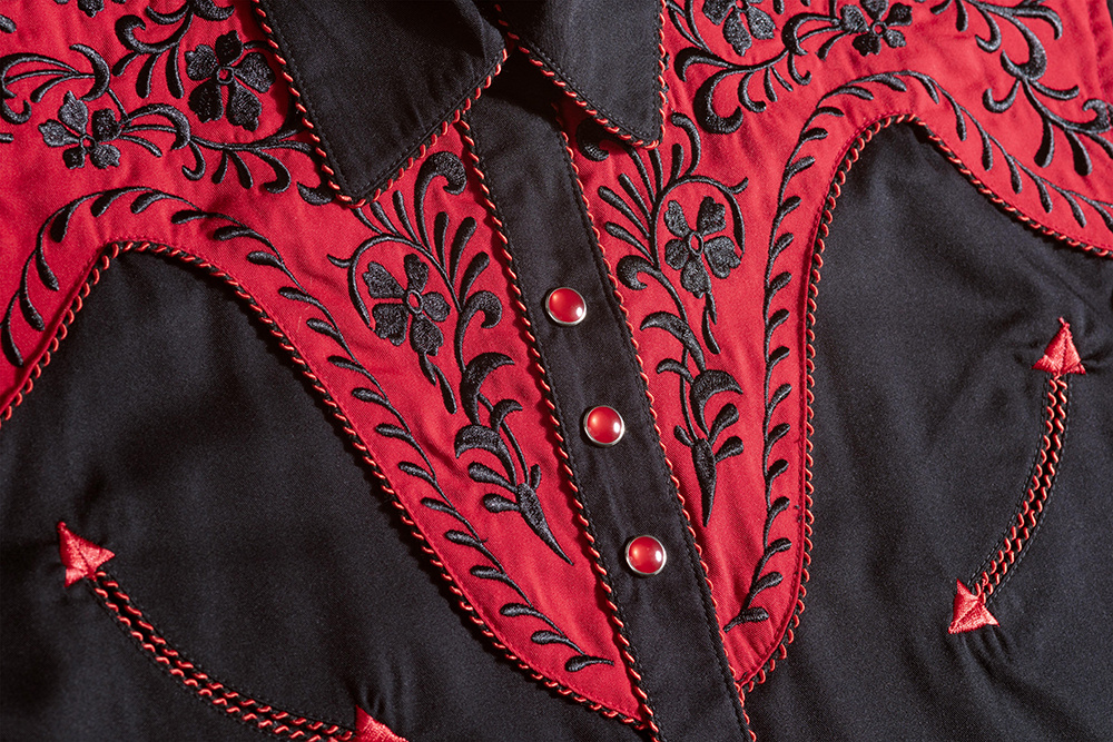 Nádherná černá westernová dámská košile s červeným westernovým sedlem a exkluzívní výšivkou na hrudi a zádech. Design doplňuje dvoubarevné lemování a stylové knoflíčky na manžetách. Do páru lze sladit s pánskou košilí Brooks.