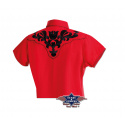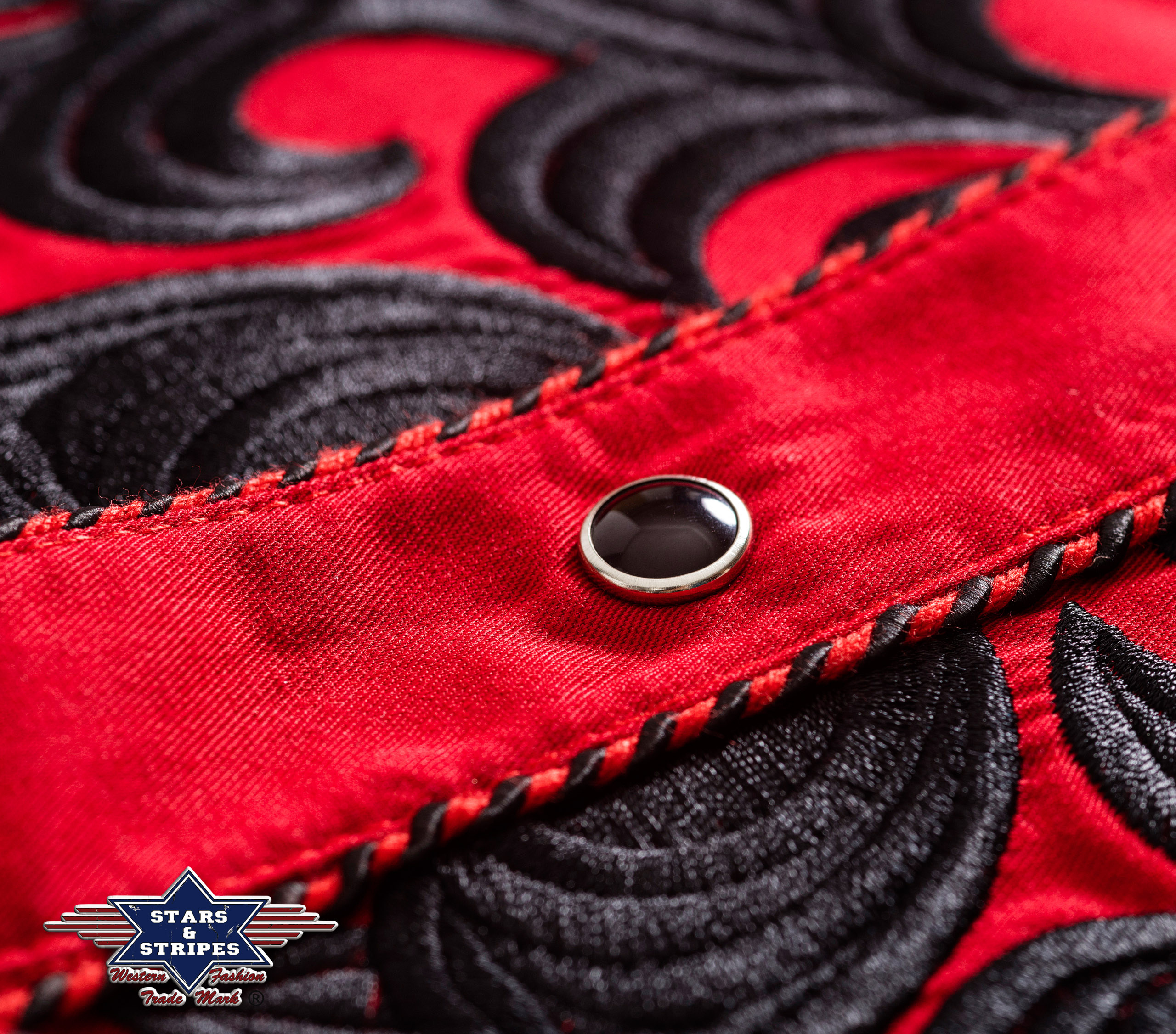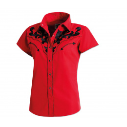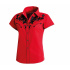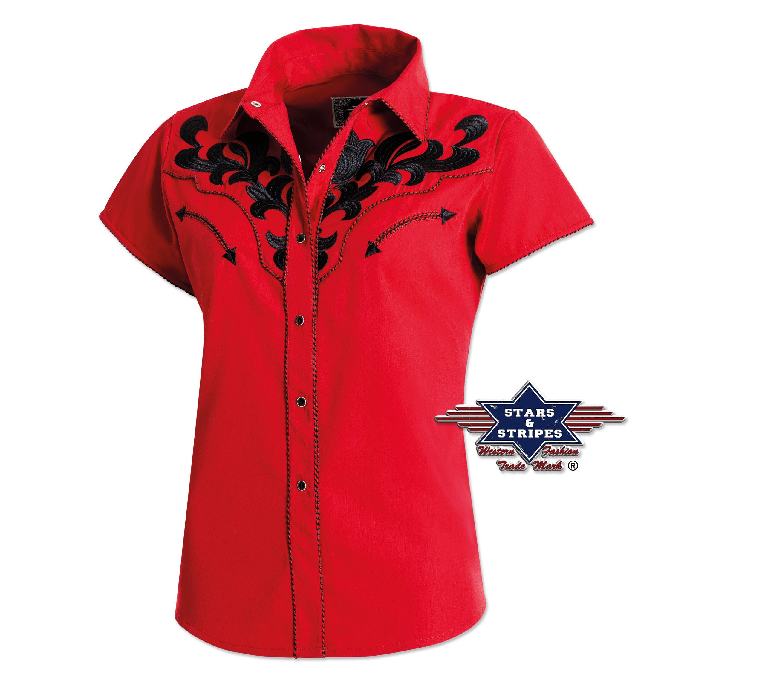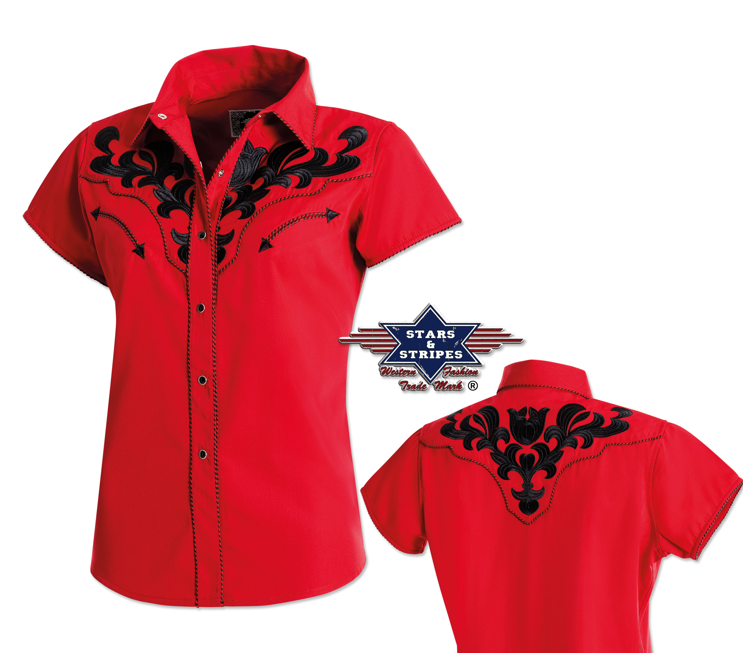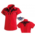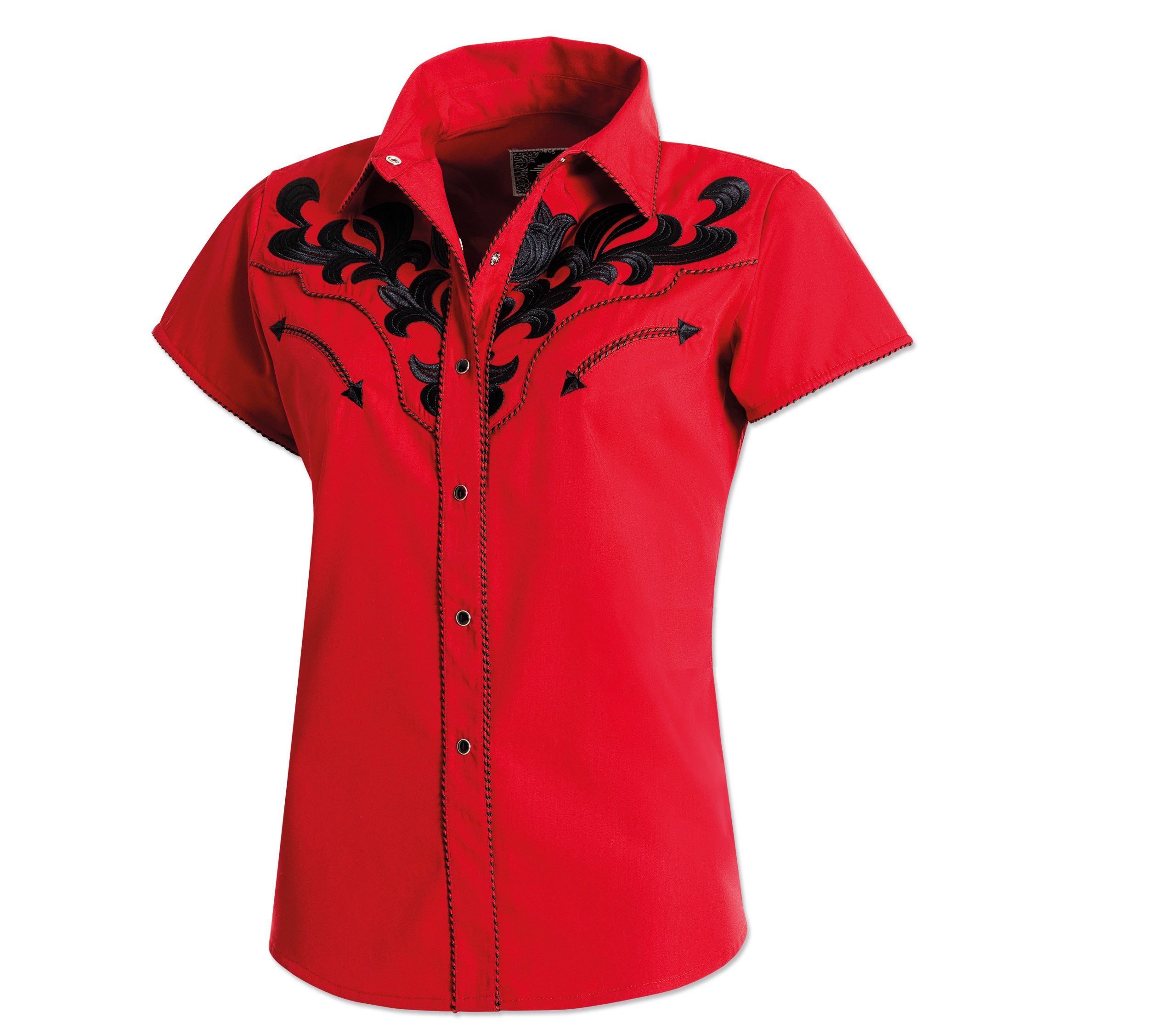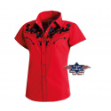 Luxusní stylová dámská westernová halenka s krátkým rukávem a s propracovanými vyšívanými vzory na hrudníku, ramenou a zádech, ve stejné barvě jsou zdobené i lemy, dvě falešné kapsy a druky na zapínání.