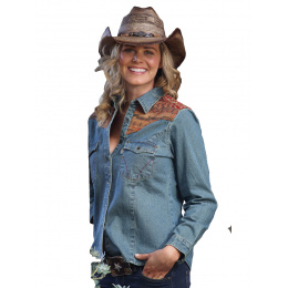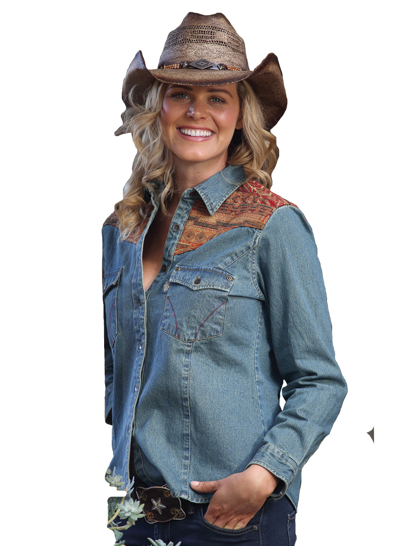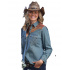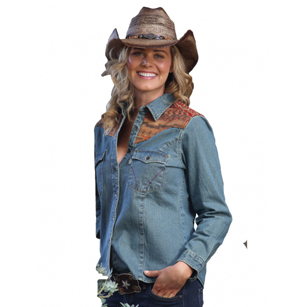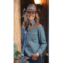 Dámská riflová westernová košile s okrasným vyšívaným vzorem na ramenou.