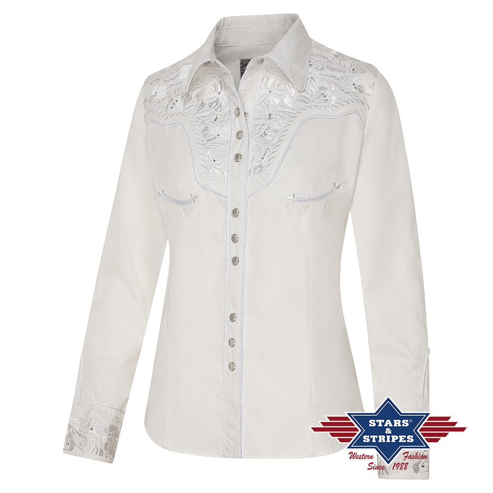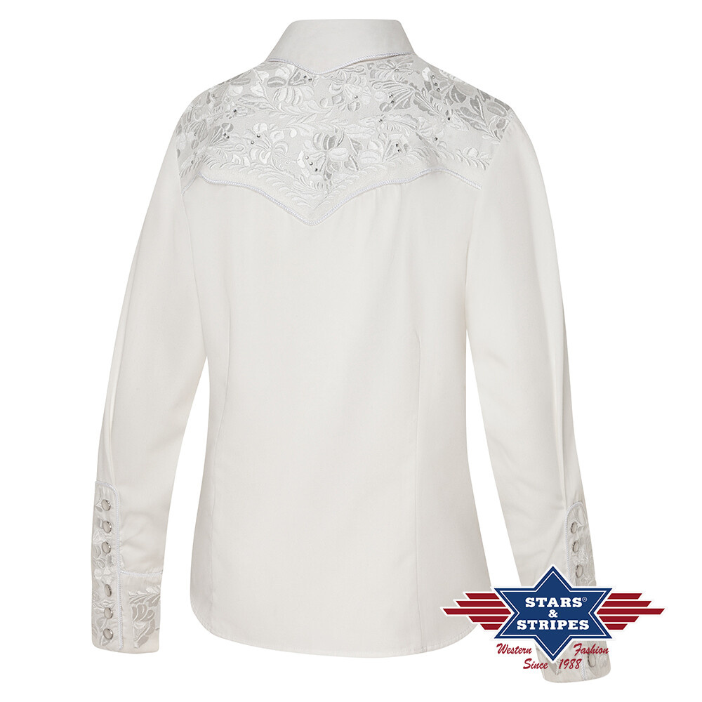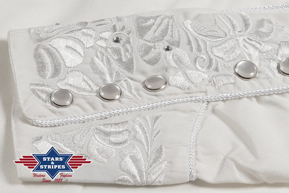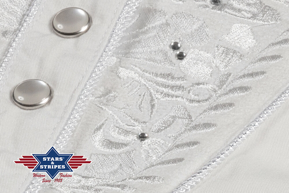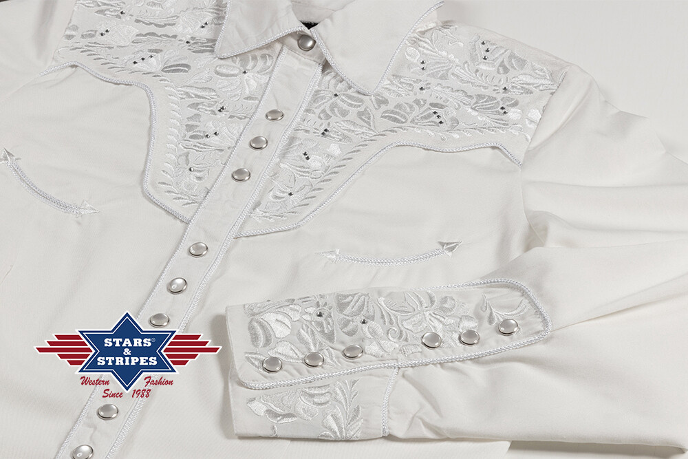 Krásná stylová dámská westernová košile s vyšívaným westernovým sedlem květinového vzoru. Košili zdobí lesklé kamínky a slušivé patentky na zapínání a rukávech.