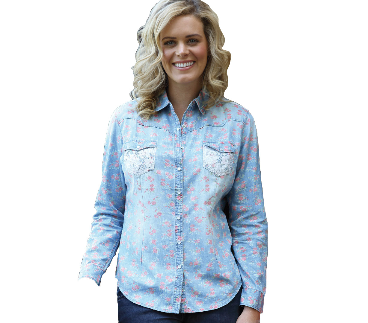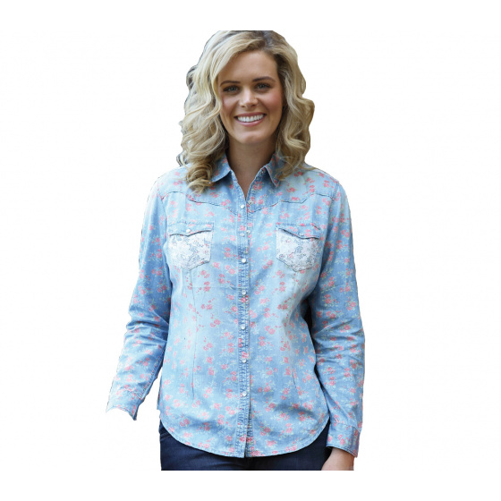 Romantická dámská riflová košile s květinkovým tištěným zdobením a krajkovým zdobením na ramenou.