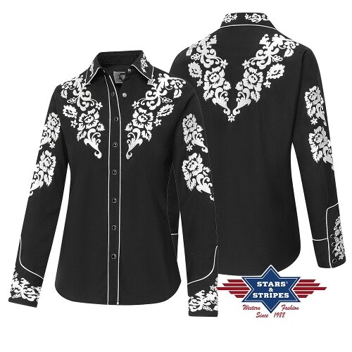 Krásná stylová dámská westernová košile s obsáhlým vyšíváním květinového vzoru. Košili zdobí bílé lemování a čtyři knoflíčky na manžetách.