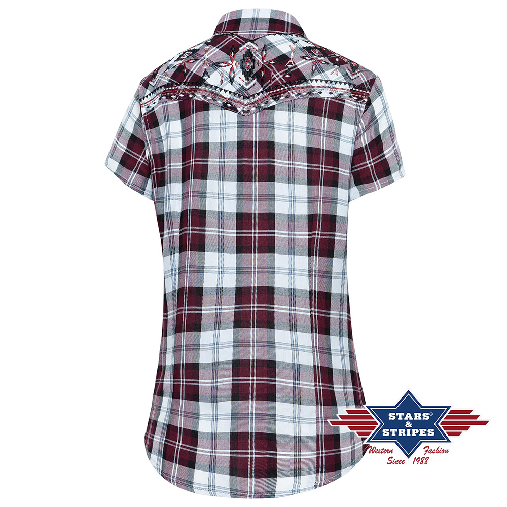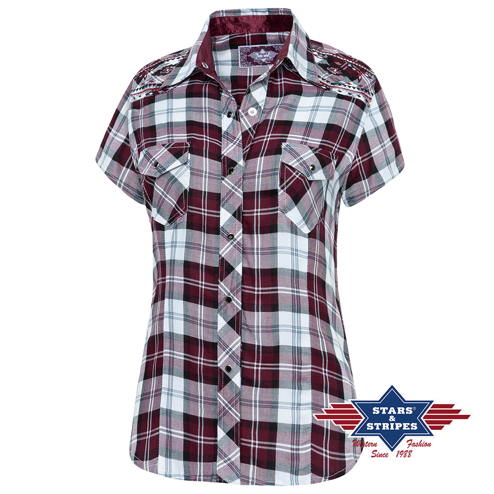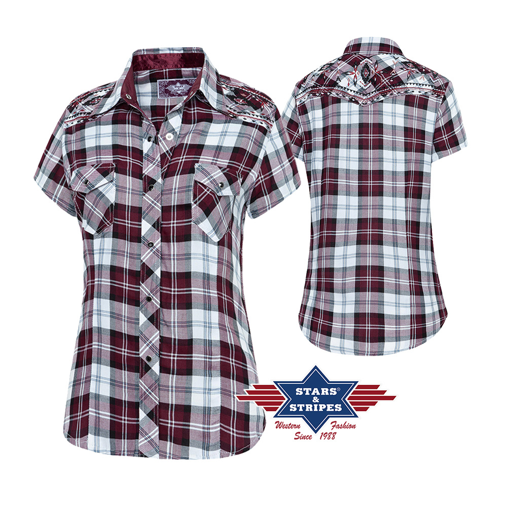 Stylová karovaná westernová dámská košile s krátkým rukávem zdobená výšivkami na ramenou. Dvě přední kapsy a zapínání na druky.
