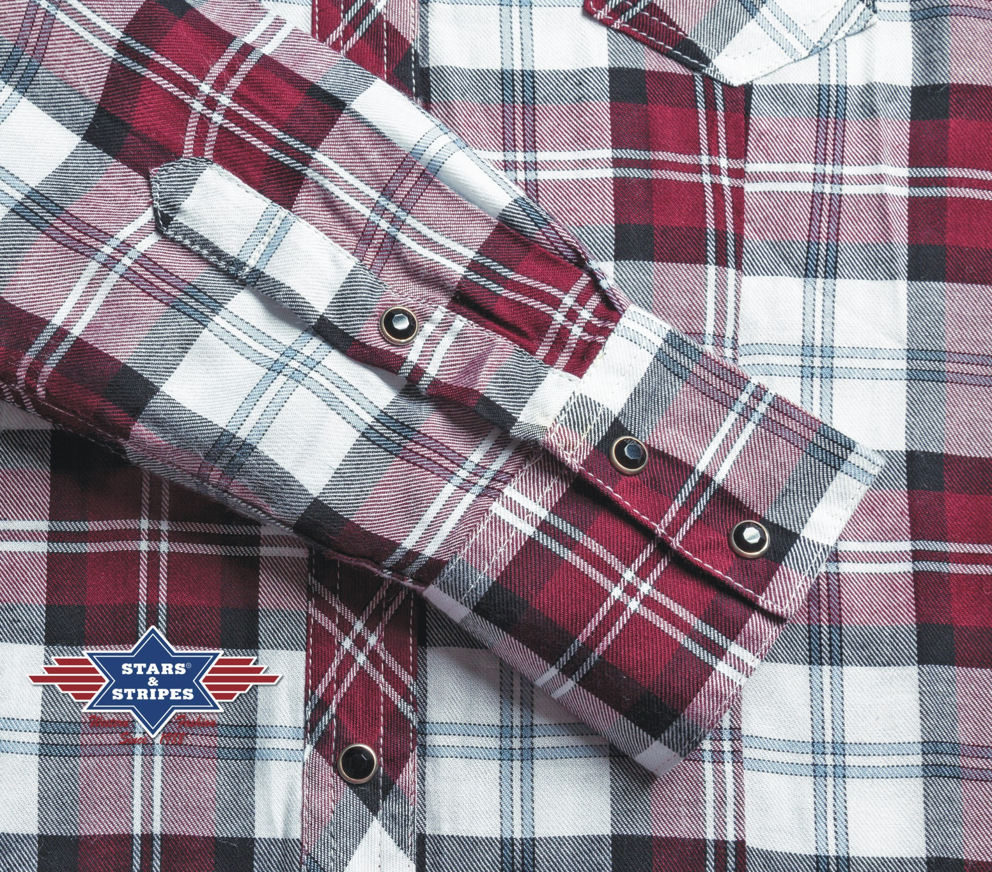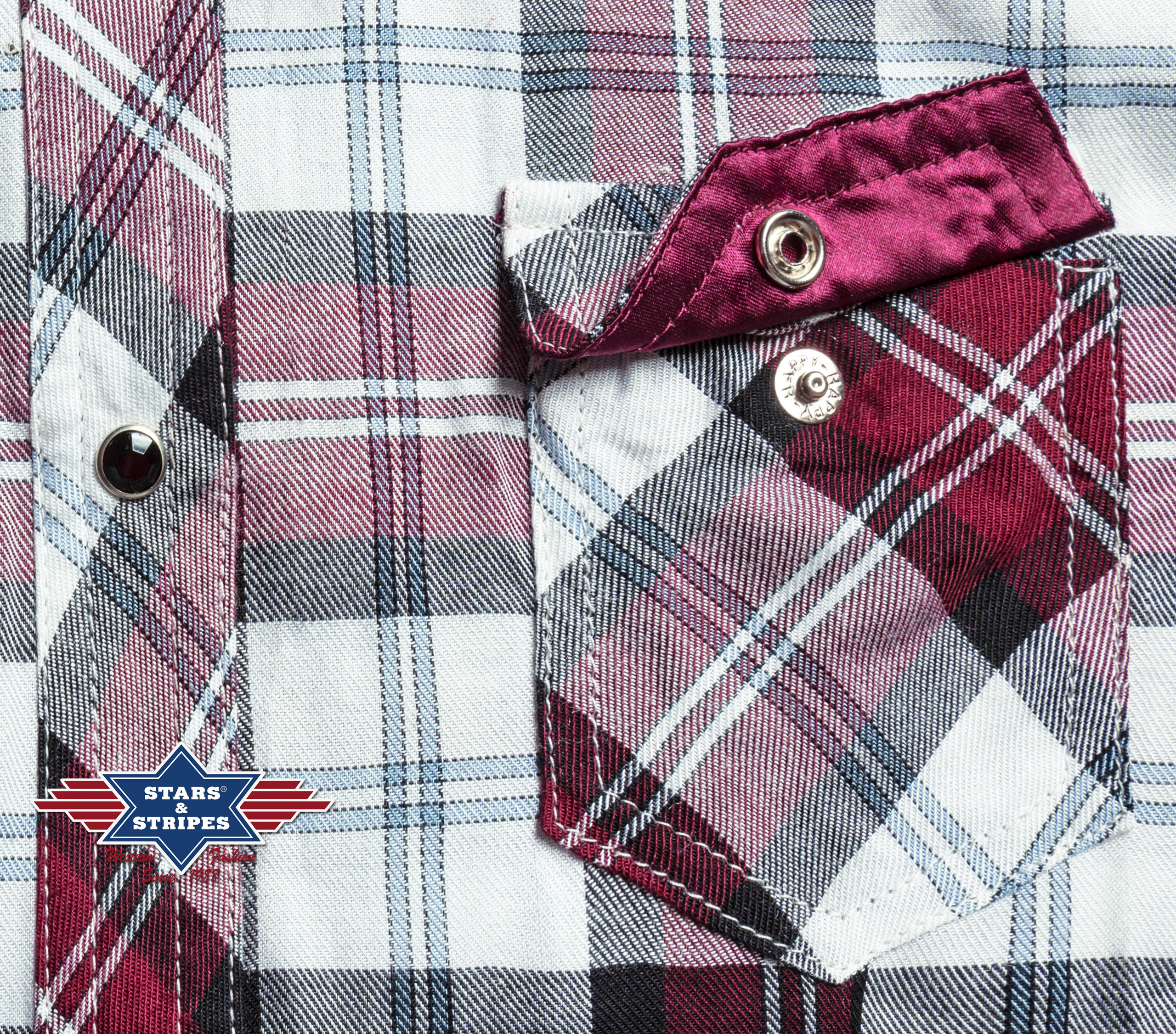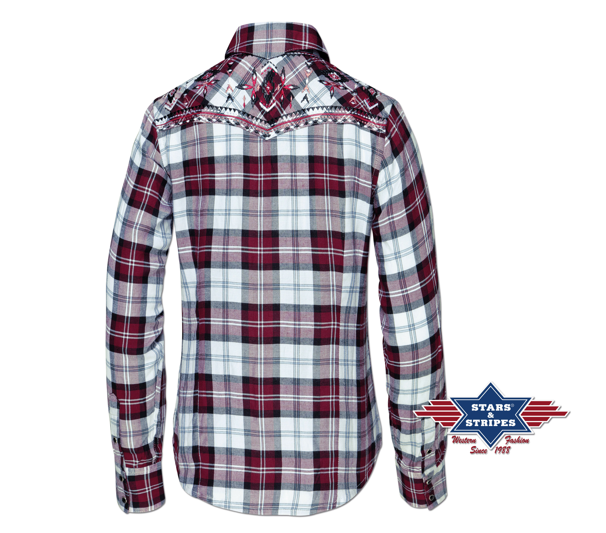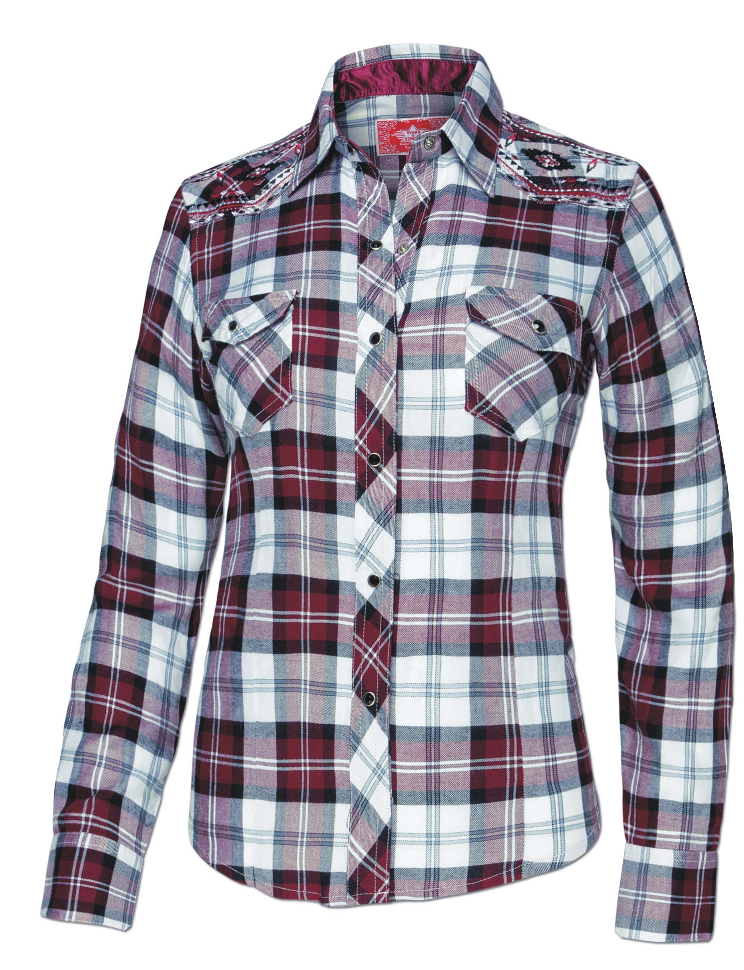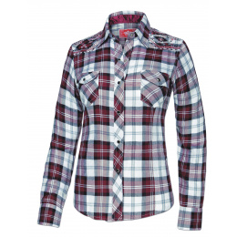 Stylová karovaná westernová dámská košile s výšivkami na ramenou. Dvě přední kapsy a zapínání na druky.