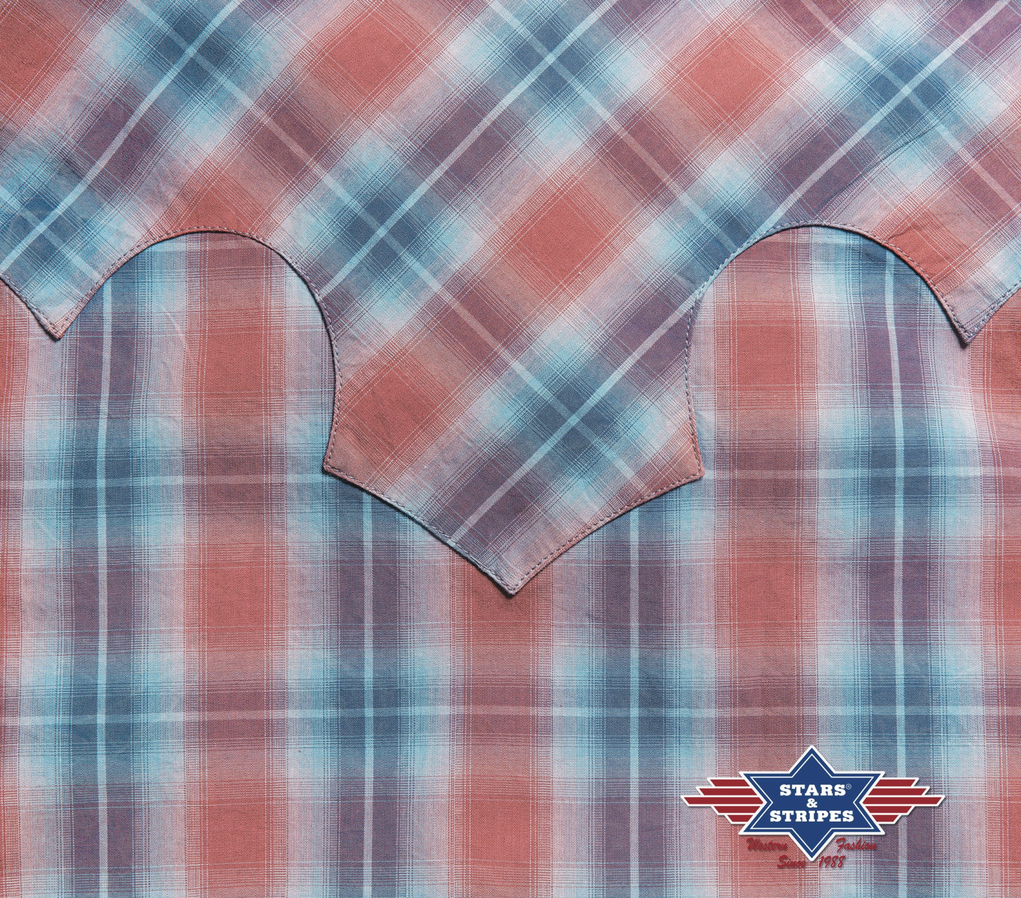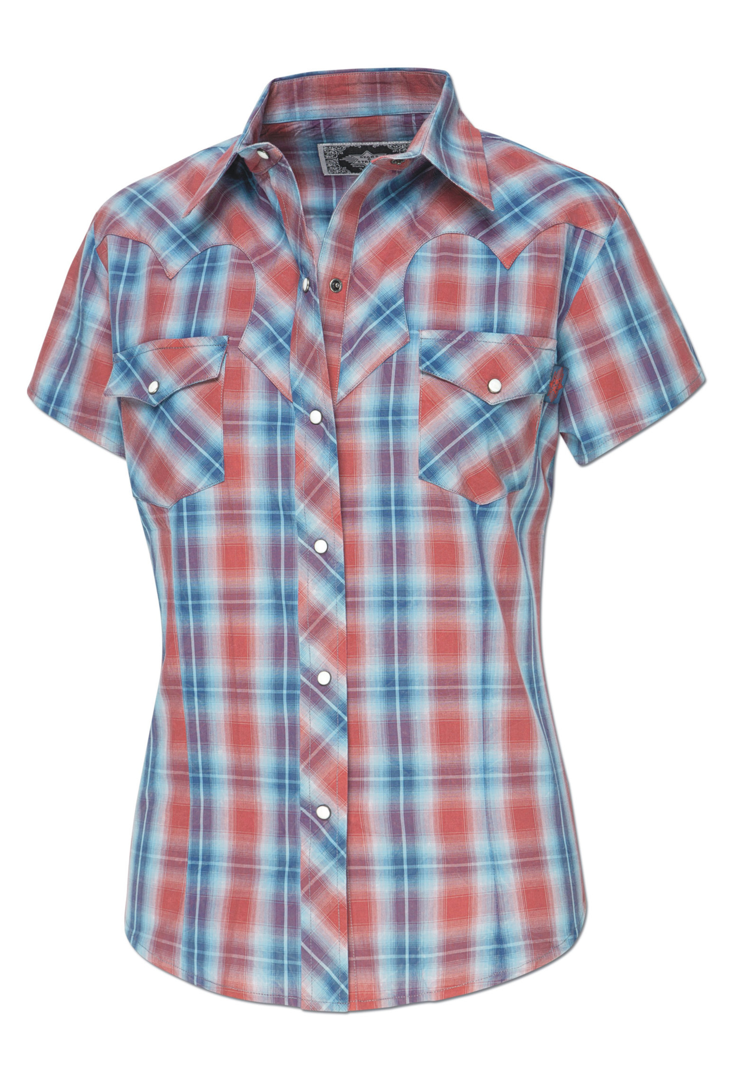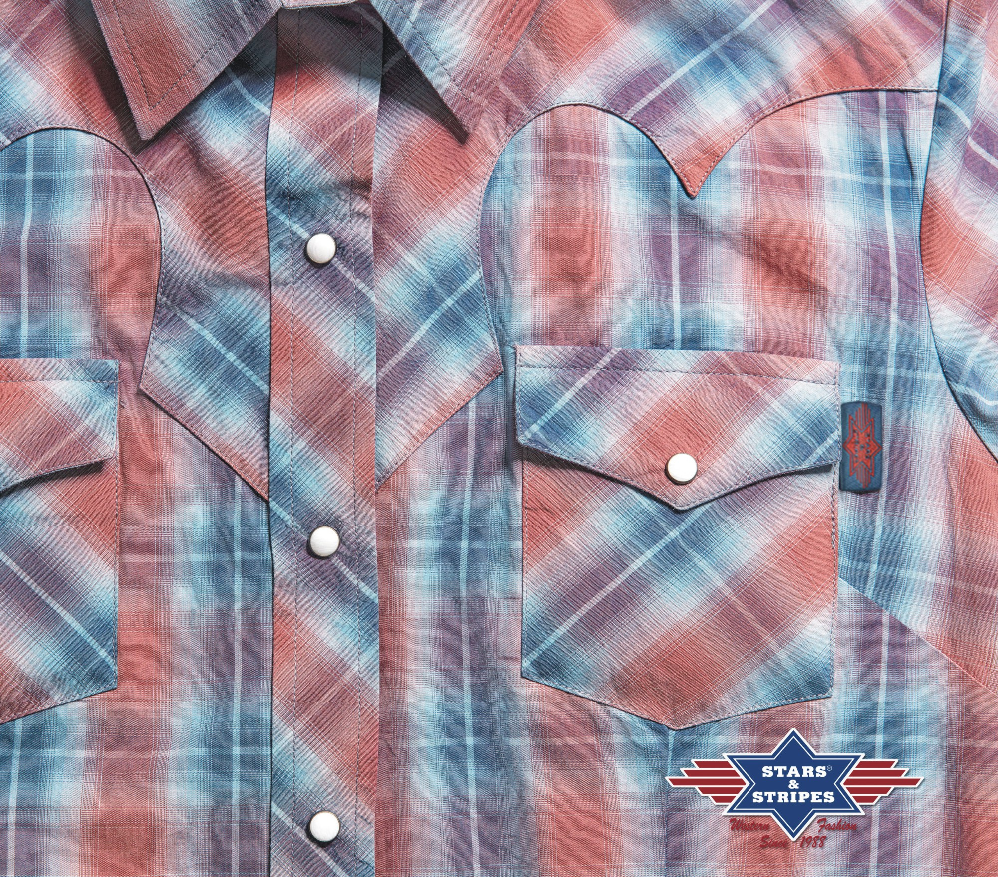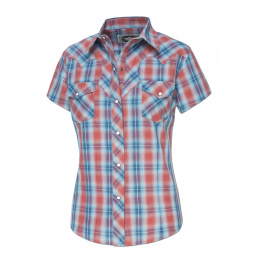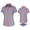Stylová karovaná dámská westernová košile s krátkým rukávem, ozdobnými švy a knoflíky.