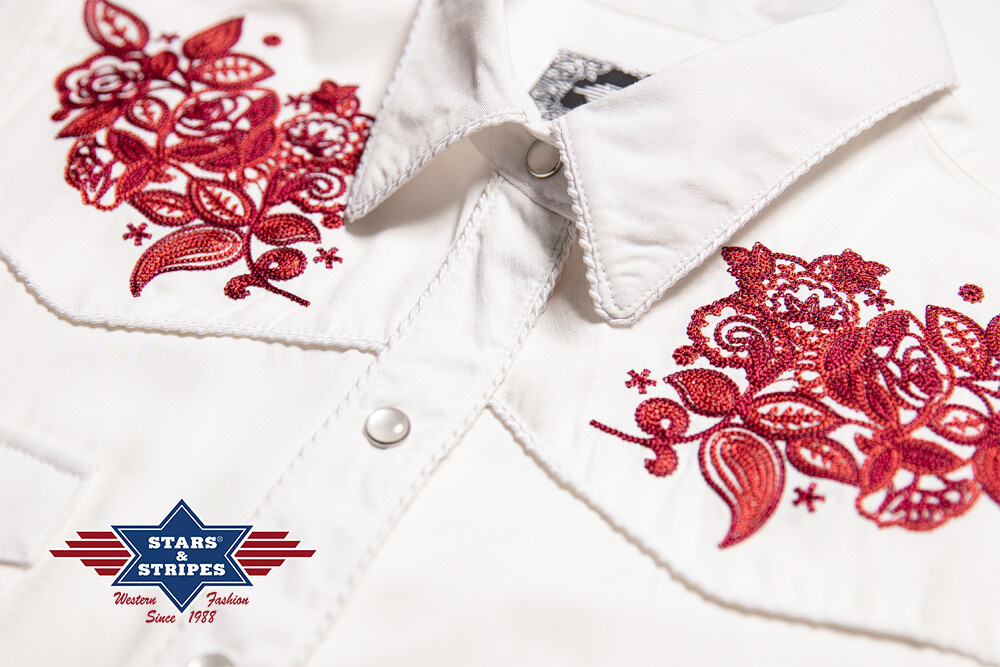Stylová, detailně vyšívaná dámská westernová halenka s krátkým rukávem, westernovým sedlem a našitými náprsními kapsami, zdobená třpytivými druky. Design doplňuje lemování sedla, knoflíkové léze a límce. Promyšlený střih perfektně zvýrazní ženskou postavu.