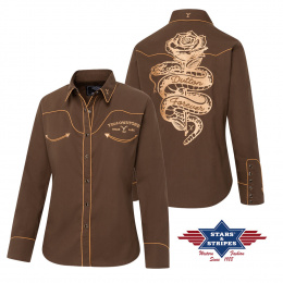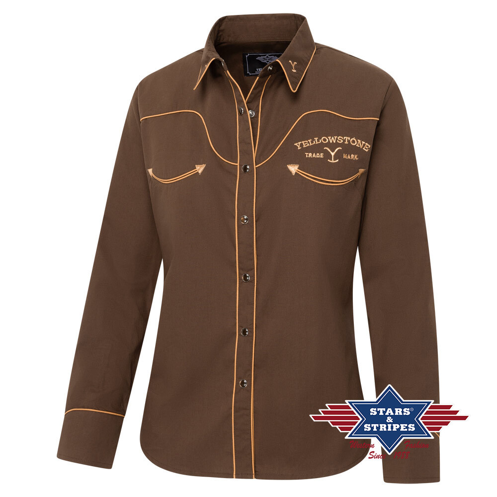 Dámská košile s westernovým sedlem z nové kolekce Yellowstone se stylovým motivem vyšitým na zádech. Zvýraznění stylu dopomáhá lemování falešných náprsních kapes a švů a stylové knoflíkové druky.