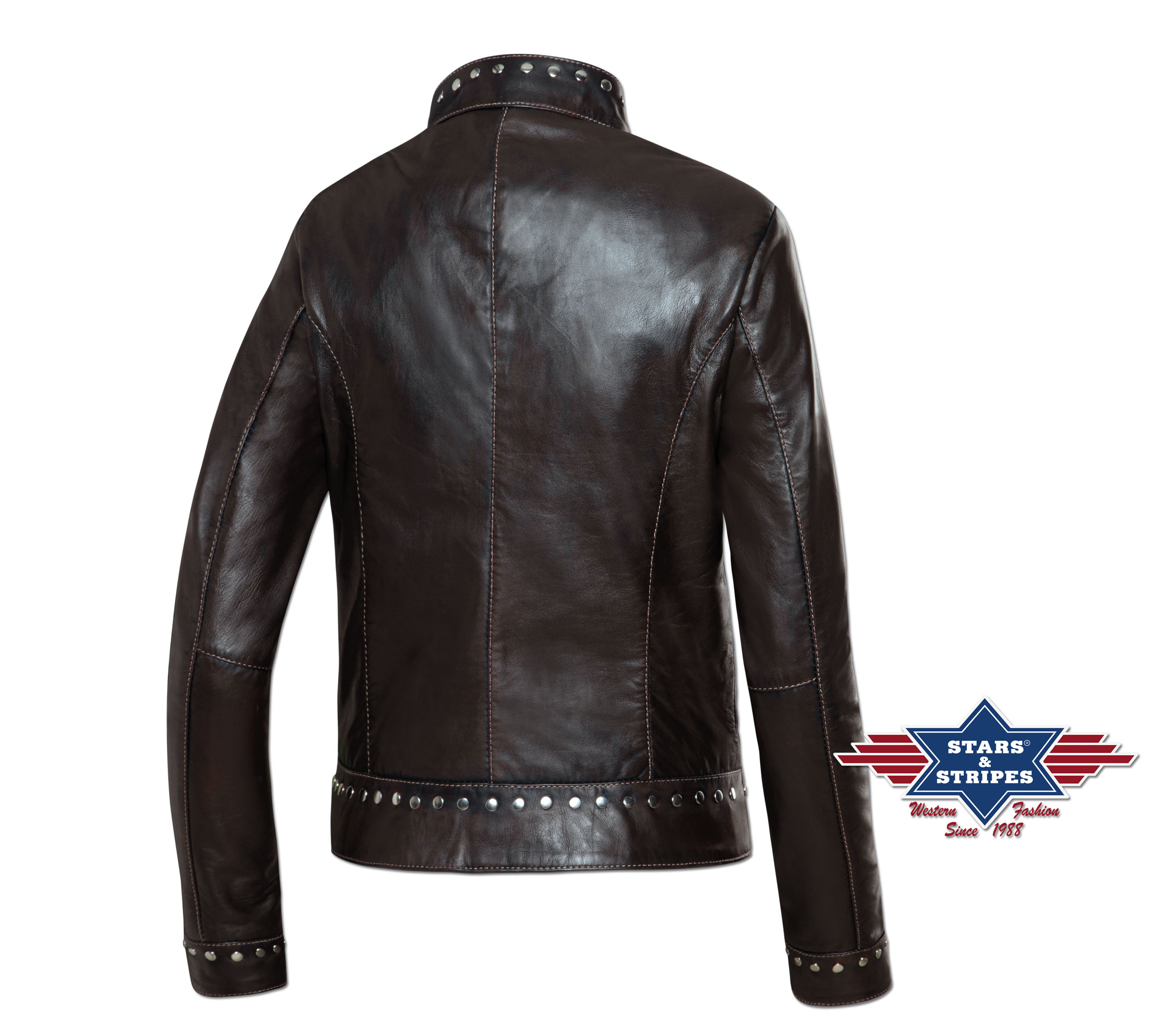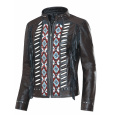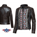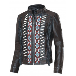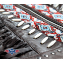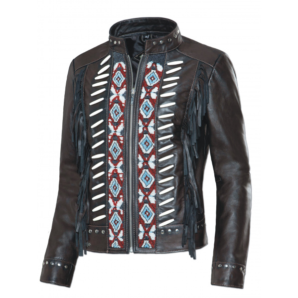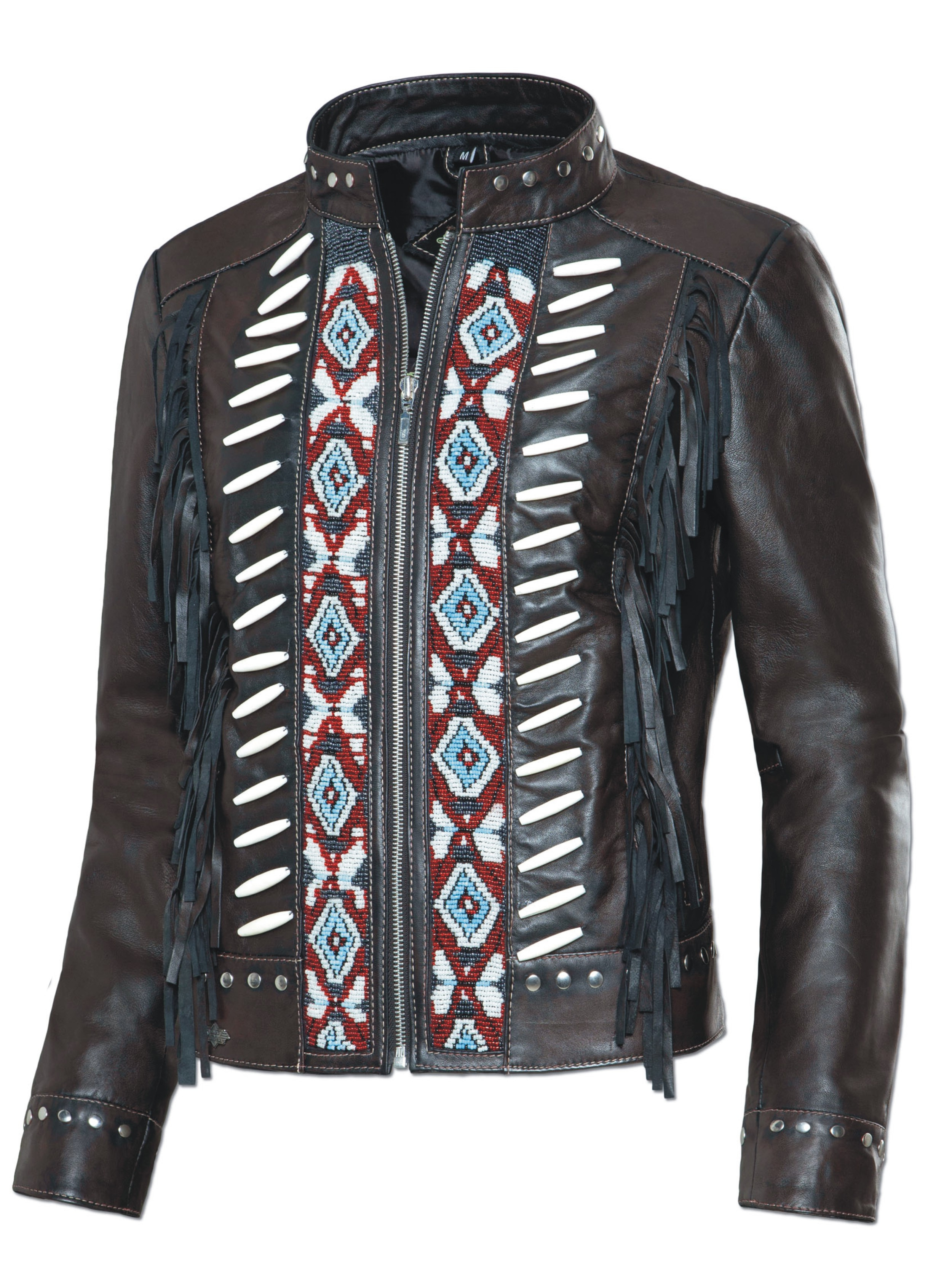 Dámská stylová kožená bunda, zdobená kosticemi, korálky, cvoky a třásněmi. Dvě kapsy zapínané zipem.