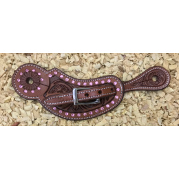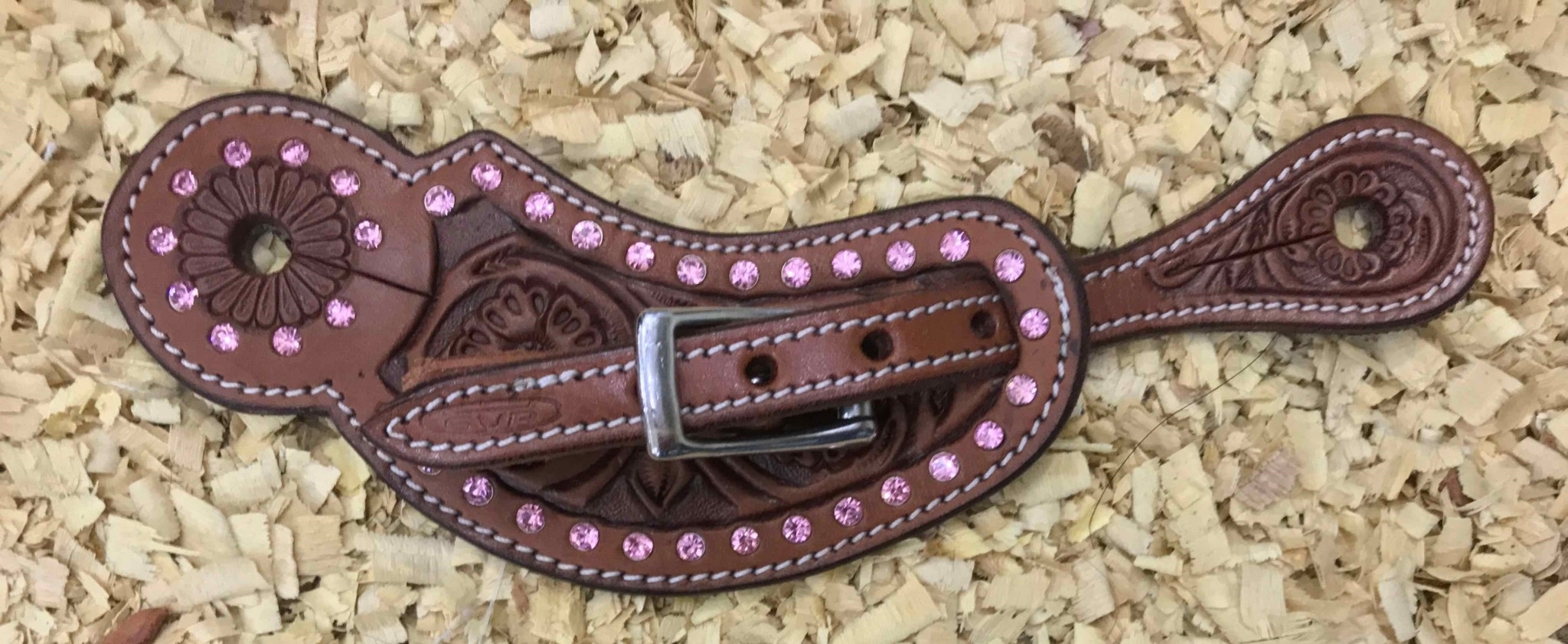 Dámské/dětské kožené řemínky k ostruhám zdobené květinovým motivem a růžovými kamínky, obšité a podložené telecí kůží, nerezové kování.