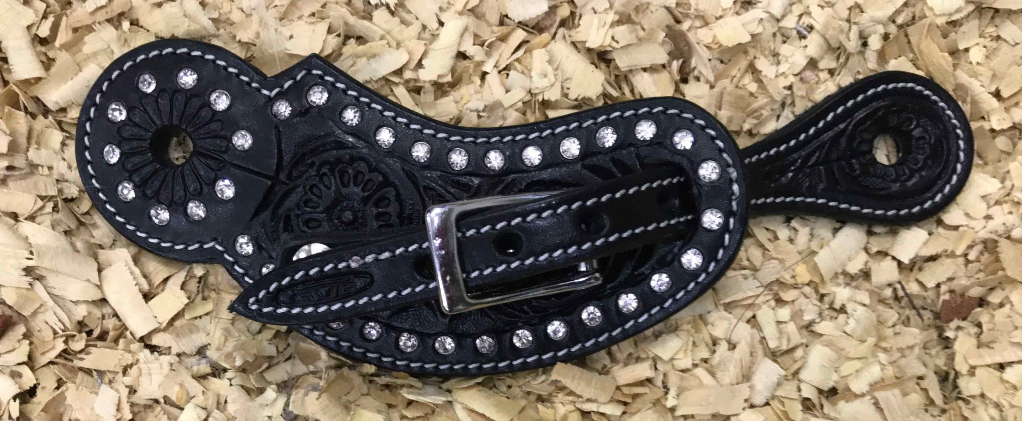 Dámské/dětské kožené řemínky k ostruhám zdobené květinovým motivem a bílými kamínky, obšité a podložené telecí kůží, nerezové kování.