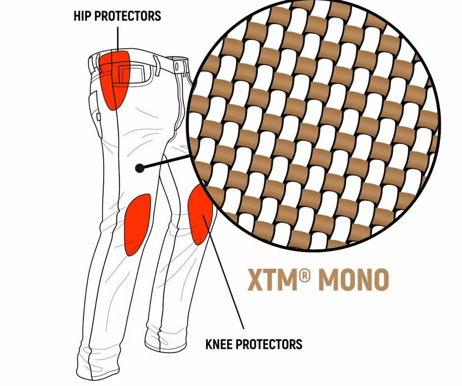 Dámské džíny Ruby od výrobce John Doe jsou jednovrstvé klasické strečové džíny upraveny (navrženy) speciálně pro jízdu na motocyklech. Díky patentovanému XTM vláknu promění klasické džíny v robustní, oděruvzdorné a nárazuvzdorné motocyklové kalhoty, které zůstávají extrémně lehké díky jediné vrstvě látky a díky strečové složce zároveň zůstavají vysoce elastické. Mají klasický slim-fit střih s pěti kapsami, vysoký pas a úzký střih nohavic. Pro zvýšení bezpečnosti jsou v kalhotách vložené nastavitelné kapsy pro chrániče na kolenou a kyčlích.