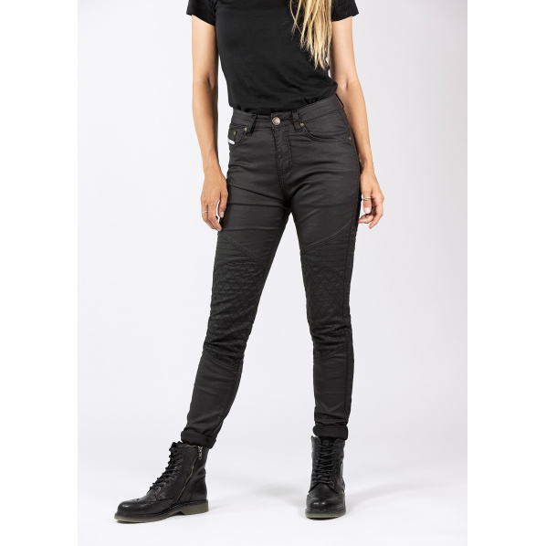 Kevlarové jeansy úzkého střihu (úplé jeansy - elasťáky) a s vysokým pasem speciálně vyvinuté pro jízdu na motocyklu. Úplý střih se výborně hodí k jízdě na motocyklu, minulostí je štípání, škubání a plácání ve větru při vyšších rychlostech. Náš speciální střih kombinovaný s klasickým 5ti kapesním jeansovým střihem je nejen velmi pohodlný, ale také funkční.