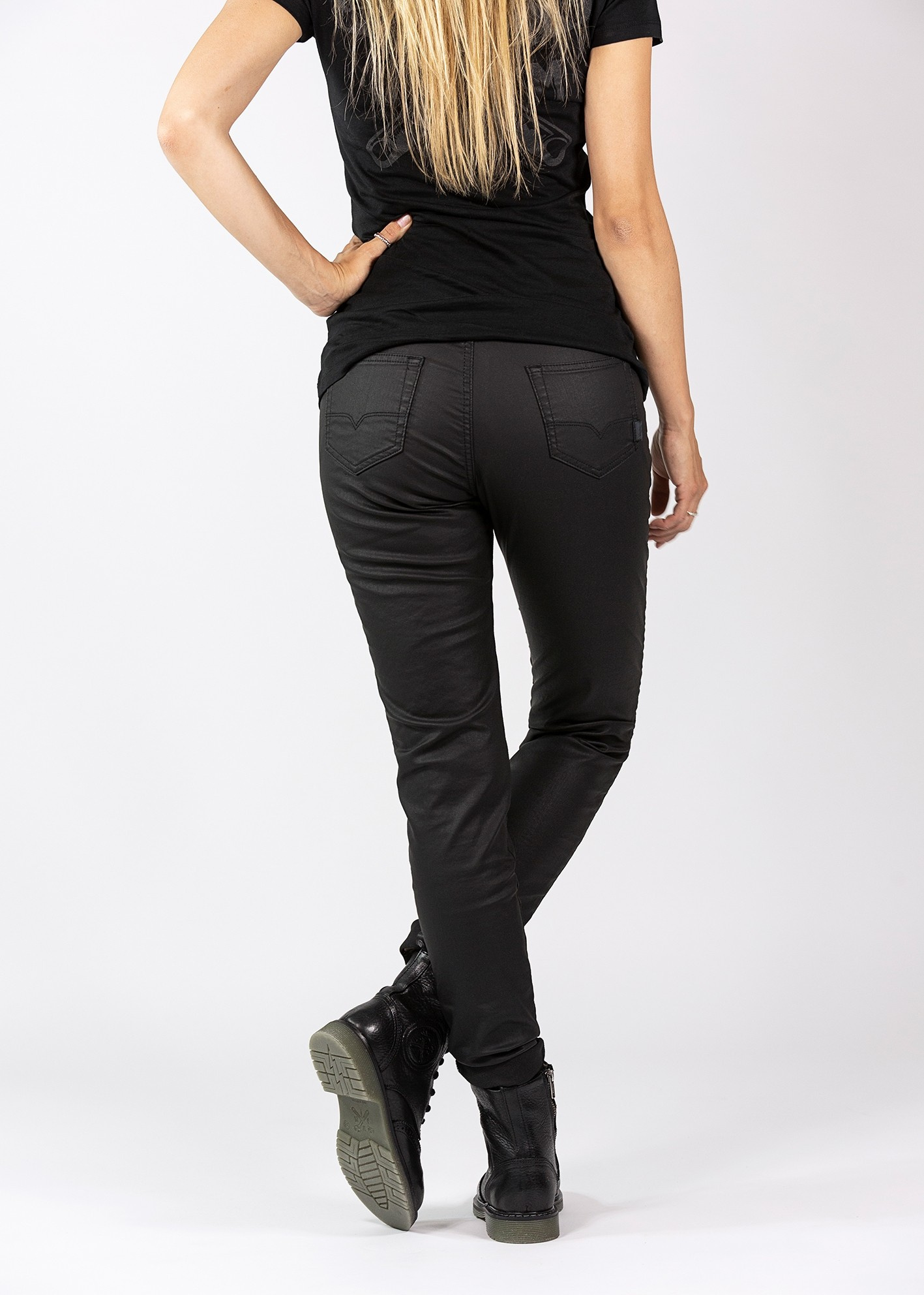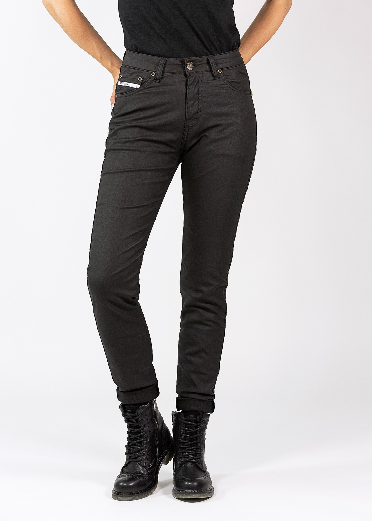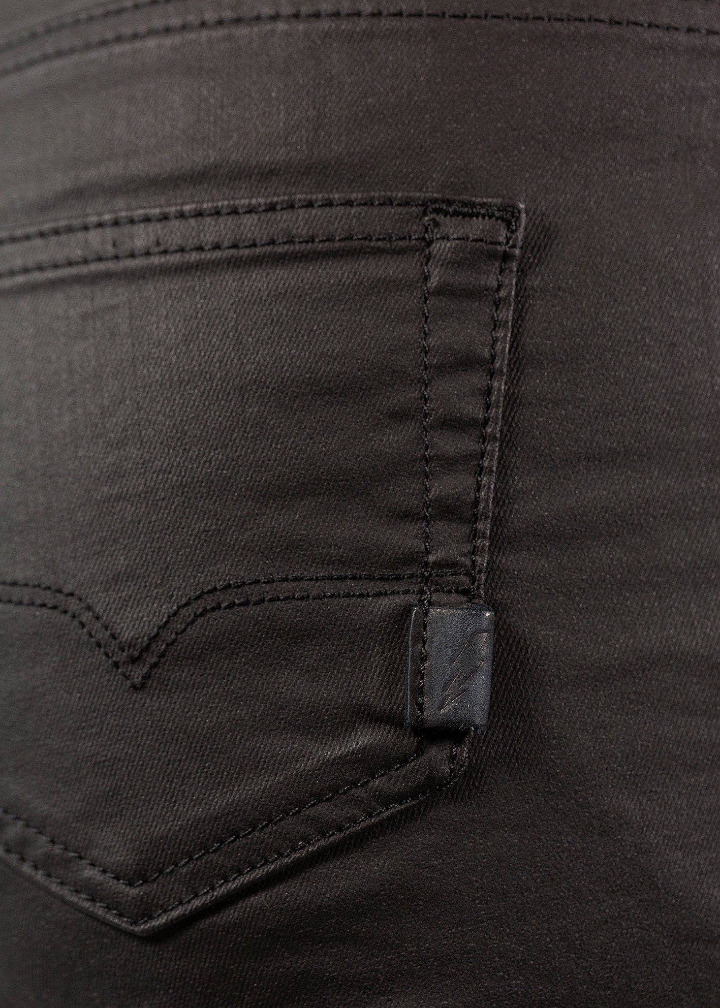 Kevlarové jeansy úzkého střihu (úplé jeansy - elasťáky) a s vysokým pasem speciálně vyvinuté pro jízdu na motocyklu. Úplý střih se výborně hodí k jízdě na motocyklu, minulostí je štípání, škubání a plácání ve větru při vyšších rychlostech. Náš speciální střih kombinovaný s klasickým 5ti kapesním jeansovým střihem je nejen velmi pohodlný, ale také funkční.