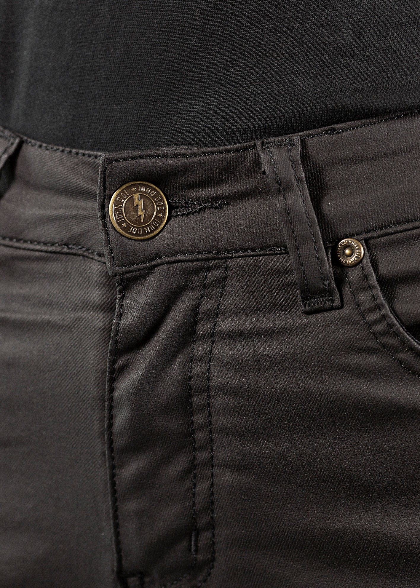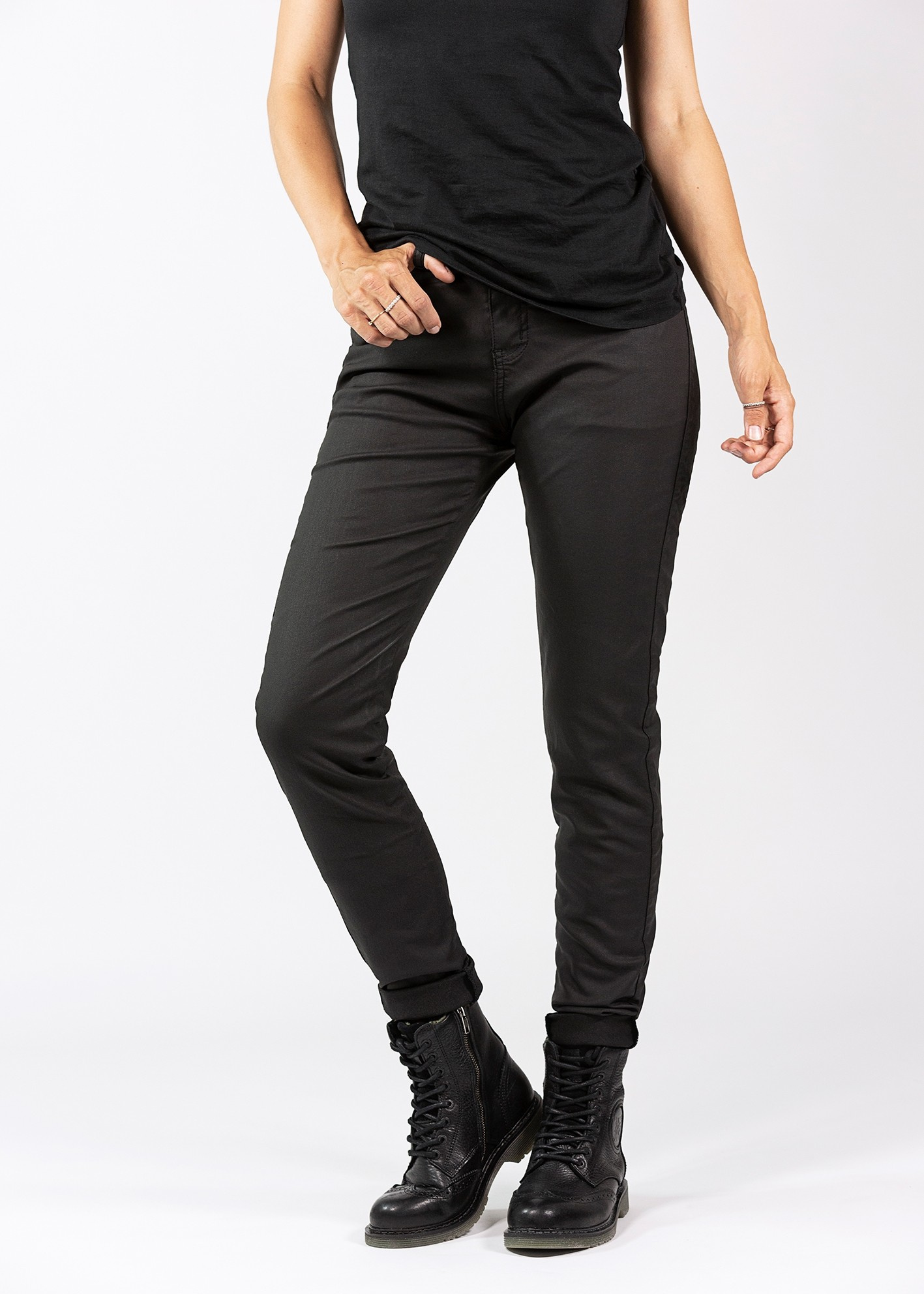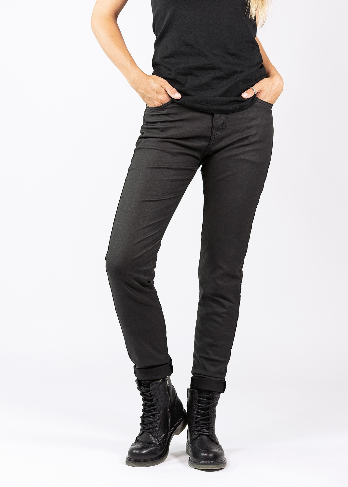 Kevlarové jeansy úzkého střihu (úplé jeansy - elasťáky) a s vysokým pasem speciálně vyvinuté pro jízdu na motocyklu. Úplý střih se výborně hodí k jízdě na motocyklu, minulostí je štípání, škubání a plácání ve větru při vyšších rychlostech. Náš speciální střih kombinovaný s klasickým 5ti kapesním jeansovým střihem je nejen velmi pohodlný, ale také funkční.