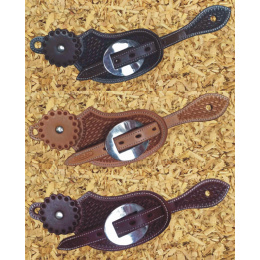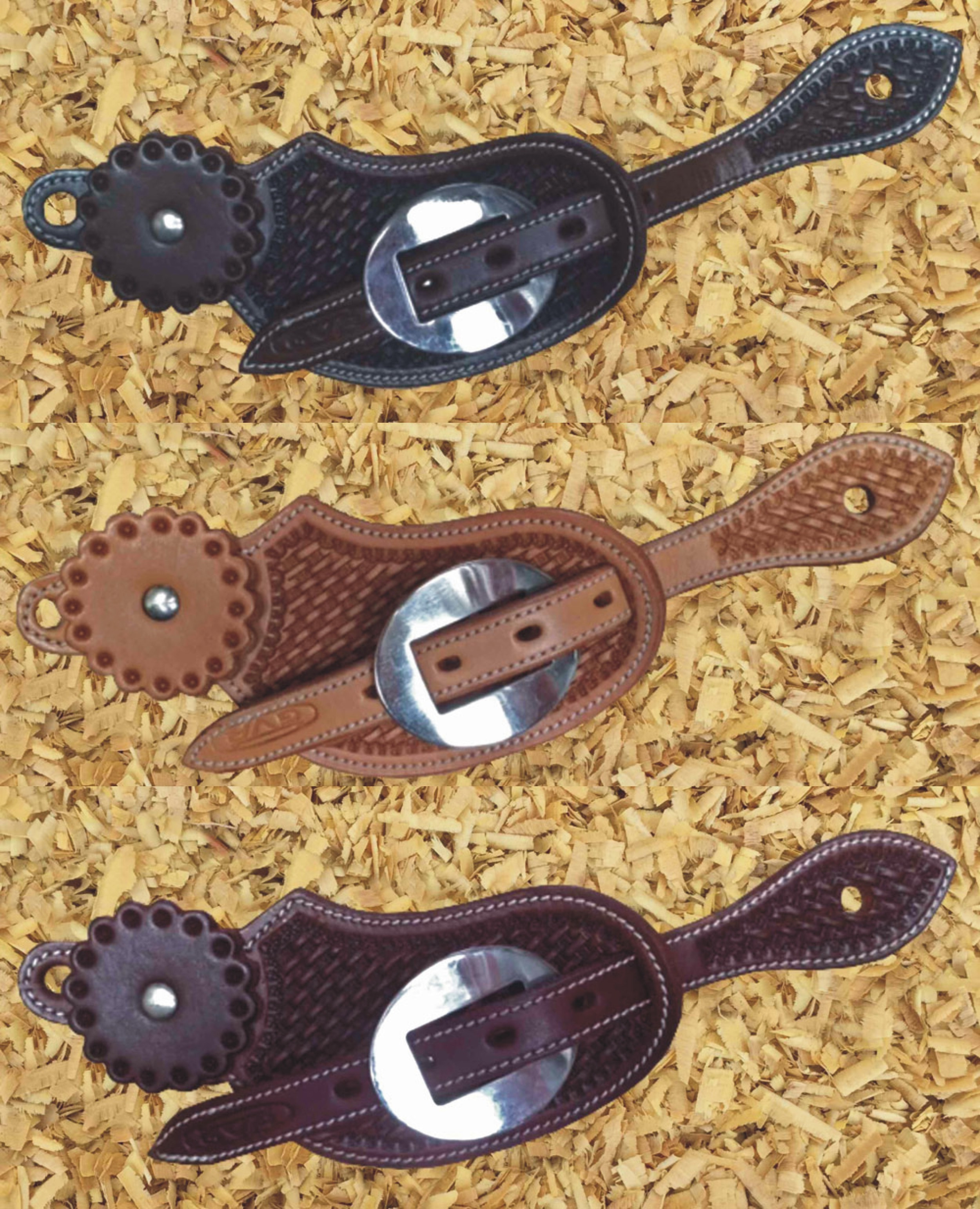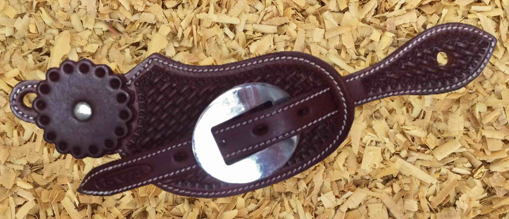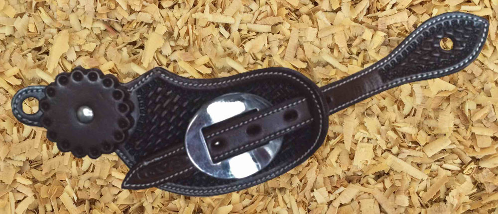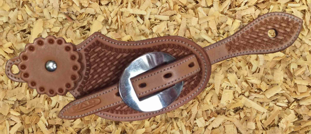 Dámské kožené řemínky k ostruhám zdobené jemným basketem a koženým končakem, obšité a podložené telecí kůží, nerezové kování.