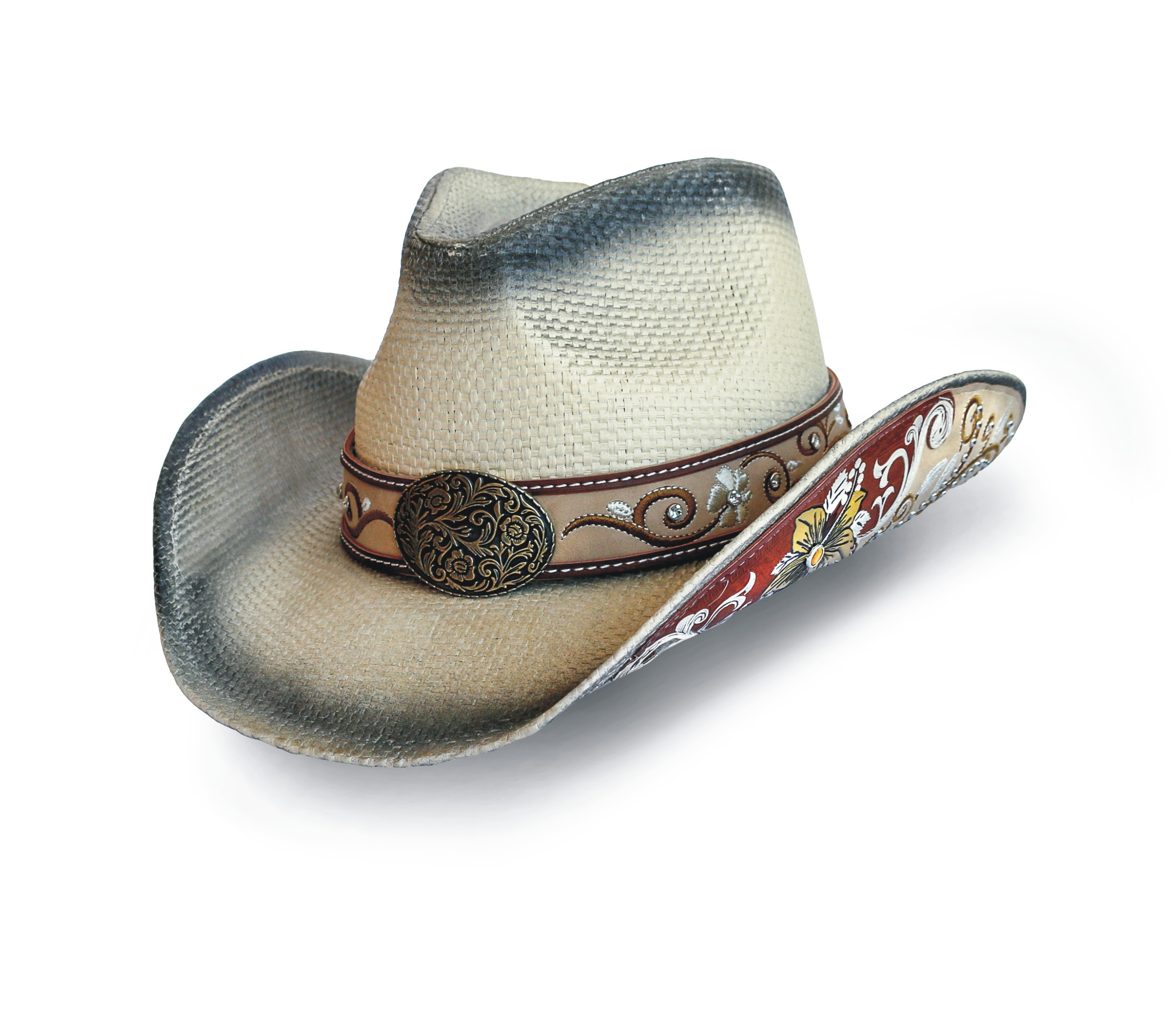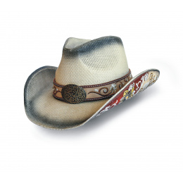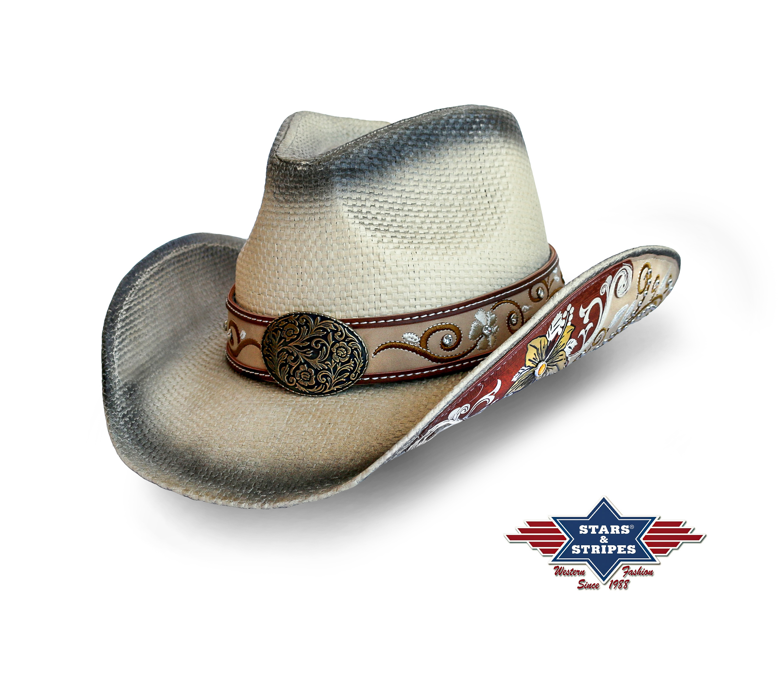 Klasický dámský westernový klobouk v zajímavé barevné kombinaci zvýrazněný propracovaným ozdobným řemínkem s výšivkami a končakem. Na okrajích našitá kůže s výšivkami květinových vzorů. Klobouk je tvarově a rozměrově stabilní, uvnitř opatřen měkkým páskem pro pohodlnější nošení.
