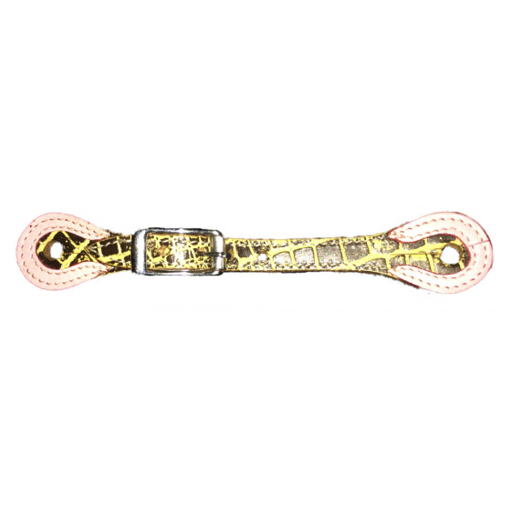 Dětské kožené řemínky k ostruhám z vysokojakostní kůže s hadím vzorem, obšité a podložené telecí kůží. Nerezové kování.