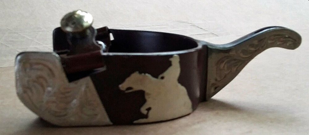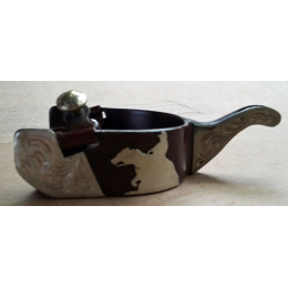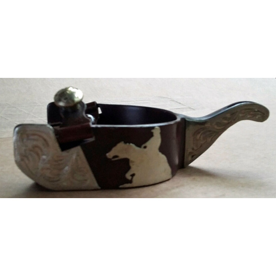 Hnědé dobytkářské ručně vyráběné ocelové ostruhy s gravírovaným stříbrným zdobením a stopkou, s motivem "reiner". Klapper stopka.