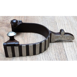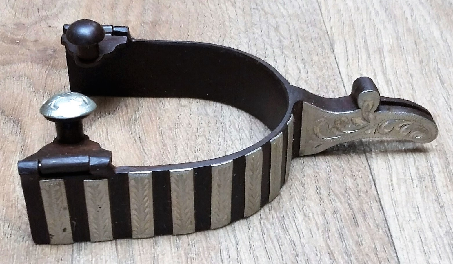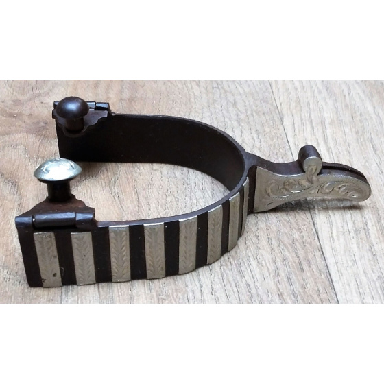 Hnědé dobytkářské ručně vyráběné ocelové ostruhy s gravírovaným stříbrným zdobením a stopkou.