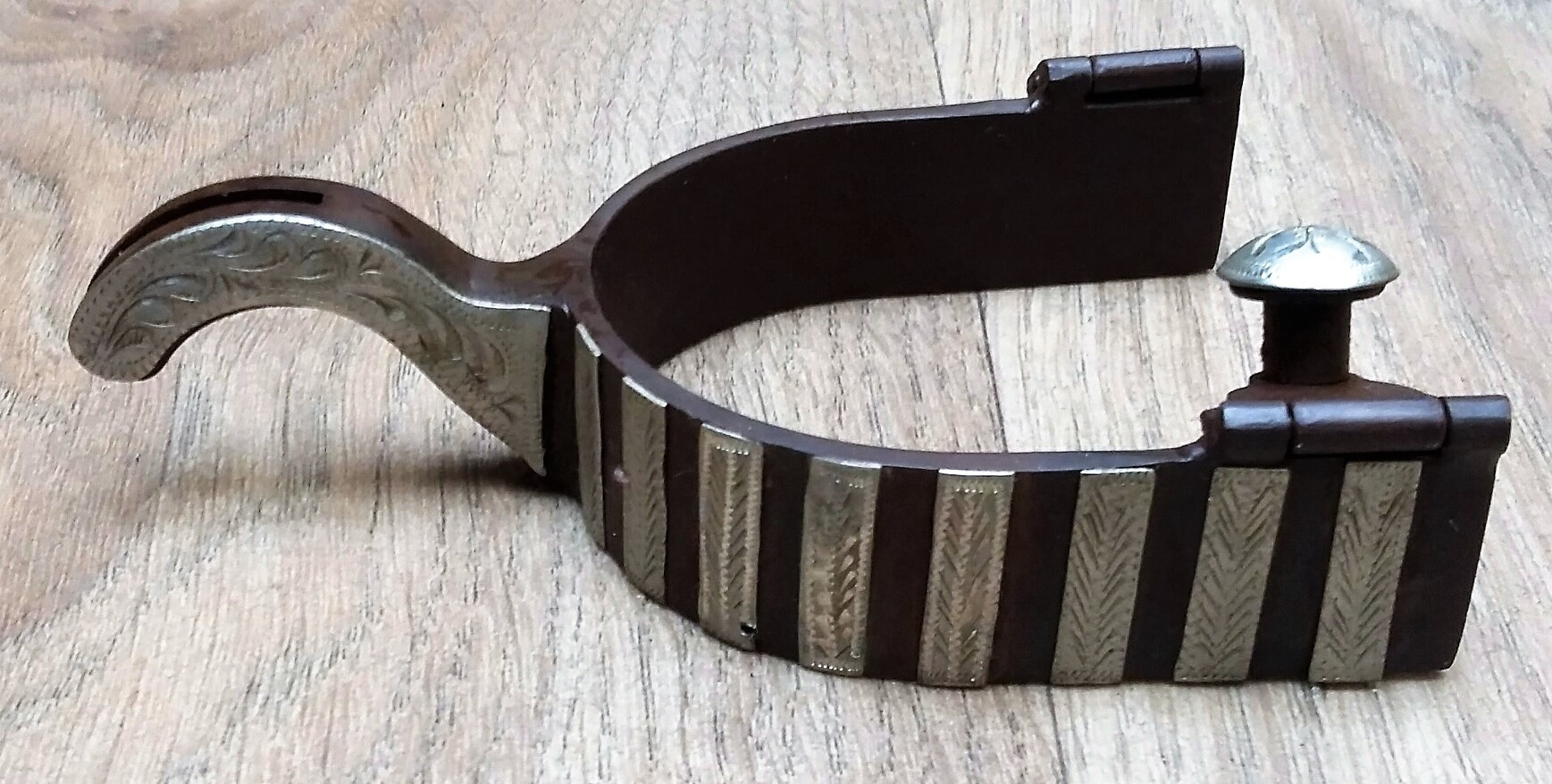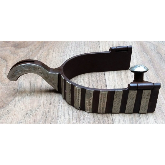 Hnědé dobytkářské ručně vyráběné ocelové ostruhy s gravírovaným stříbrným zdobením a stopkou.