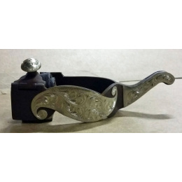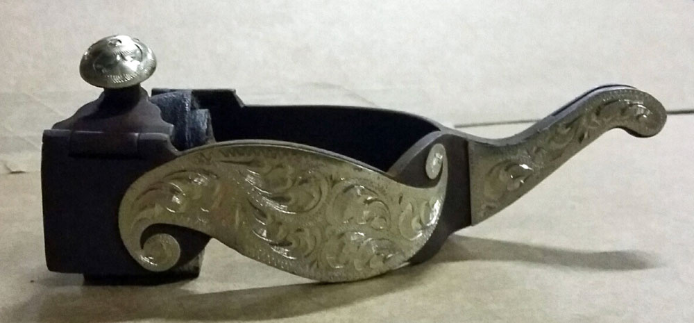 Hnědé dobytkářské ručně vyráběné ocelové ostruhy s gravírovaným stříbrným zdobením a stopkou.