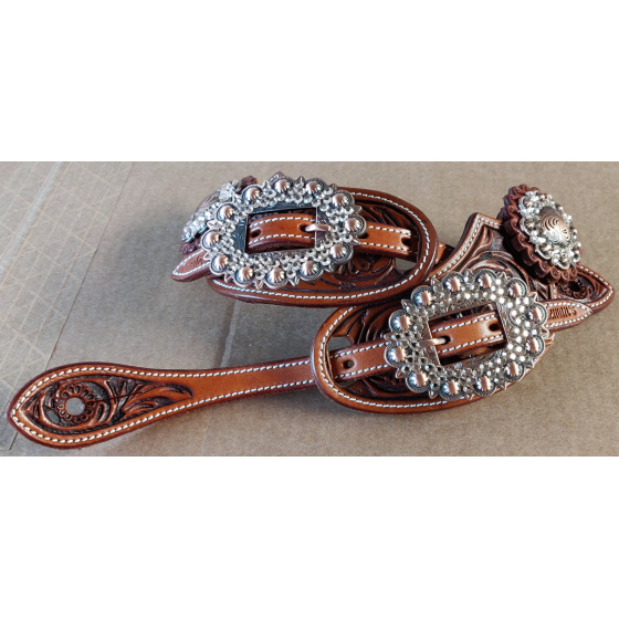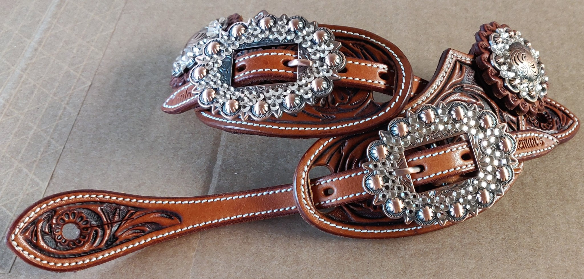 Westernové kožené řemínky k ostruhám Cattleman´s zdobené květinovým motivem, obšité a podložené telecí kůží, stříbrná přezka a končak s měděným nádechem.