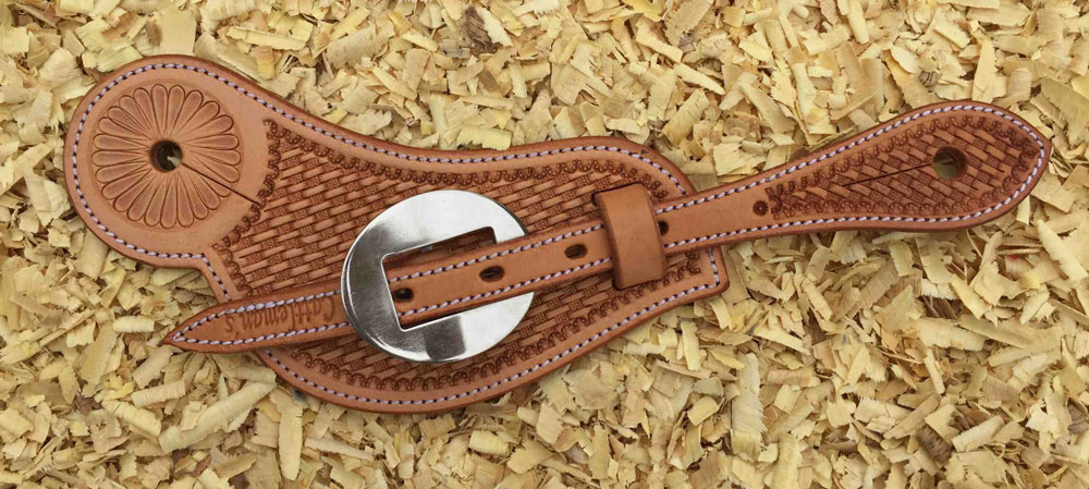 westernové kožené řemínky k ostruhám Cattleman´s zdobené basketem, obšité a podložené telecí kůží. Nerezové kování.